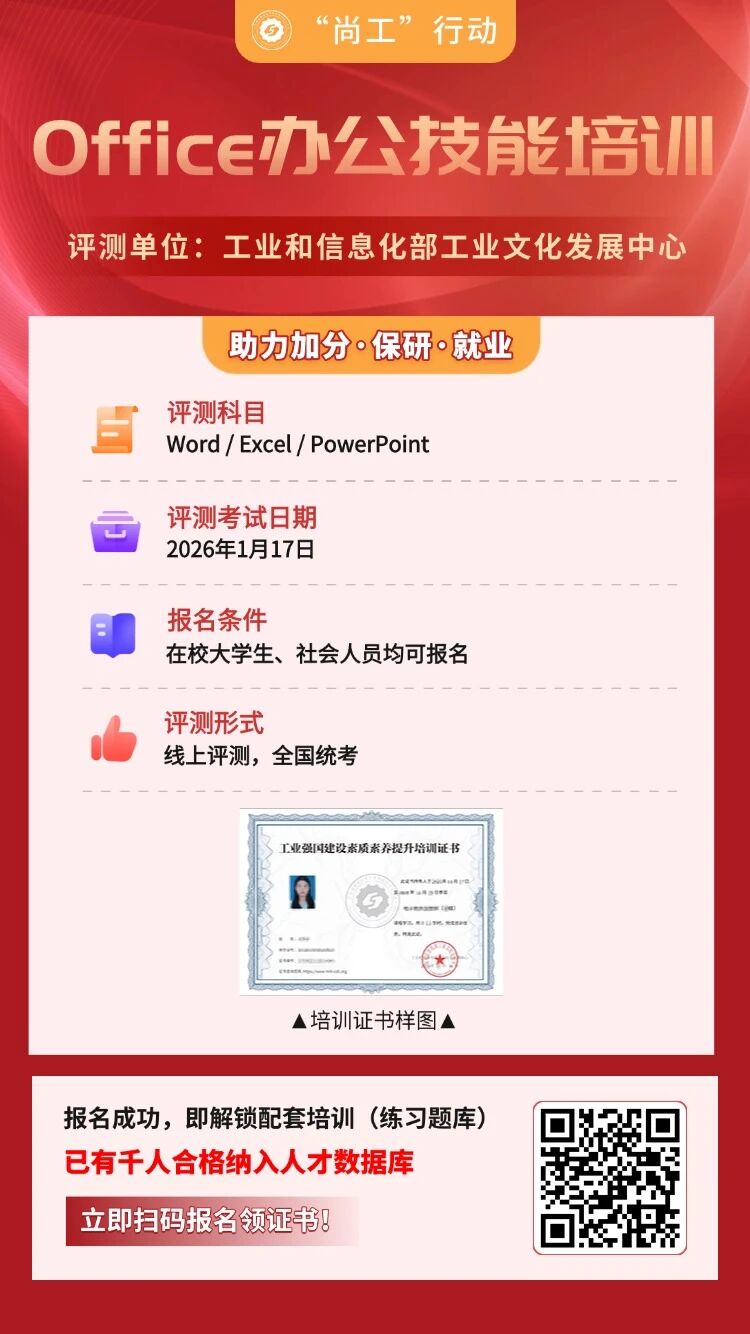1、证书等级 Office办公技能岗位能力评测分为初级、中级、高级三个级别。 其中,初级、中级、高级岗位能力评测证书,通过评测考试,成绩合格后,即可申报; 2、考试场次 工业和信息化部工业文化发展中心每月安排全国线上统考,考生报名时,需提前预约考试场次。 zui新考试期次:2026年1月17日。 考生可根据自身情况和实际能力选考一科或多科(不限等级),报名参加岗位能力评测。
