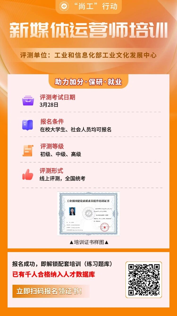 【新媒体运营师证书】适合大学生,报名即刻解锁课程题库 评测单位:工业和信息化部工业文化发展中心 考试时间:2026年3月28日 报名官网:www.icdc-pc.org.cn