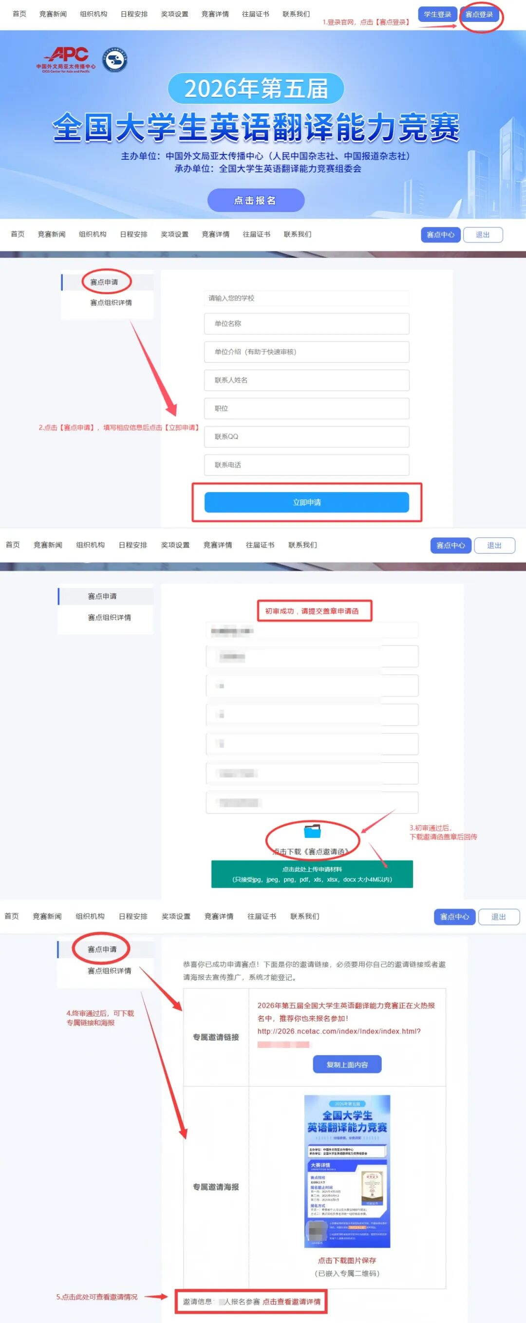 于竞赛官网http://www.ncetac.com/通过【赛点登录】按钮,使用申请人本人QQ号登录,完善赛点相应信息后,下载赛点院校申请表,按要求填写并盖章后回传申请表,等待审核通过。(示意图如下)
