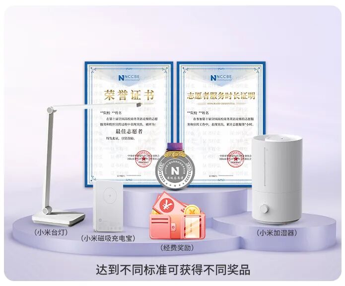 5.邀请11人及以上成功报名参赛,可获得最佳志愿者证书(电子版+纸质版)+电子版《志愿时长证明》+纪念奖章+小米磁吸充电宝或小米加湿器一个。