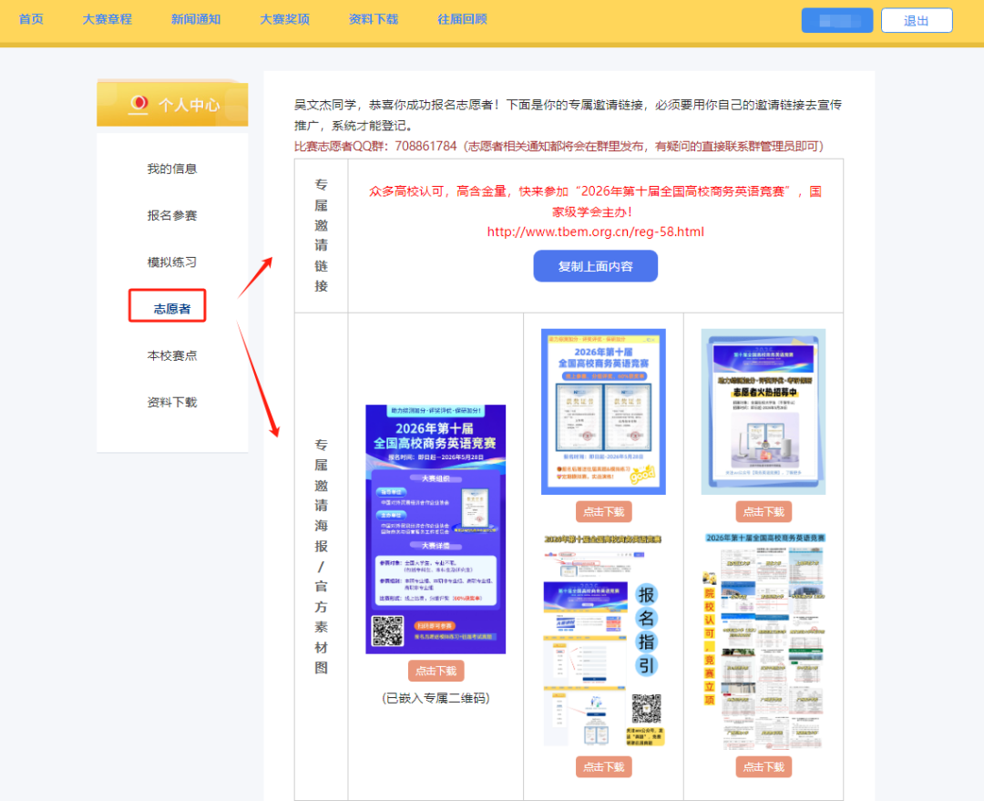 2.成功报名参赛指:通过志愿者本人的专属邀请链接或海报,注册并报名成功。