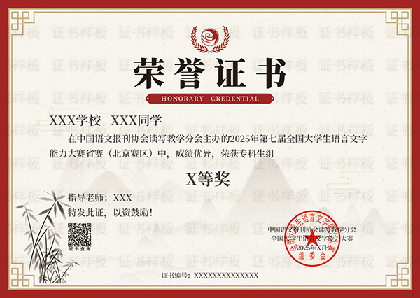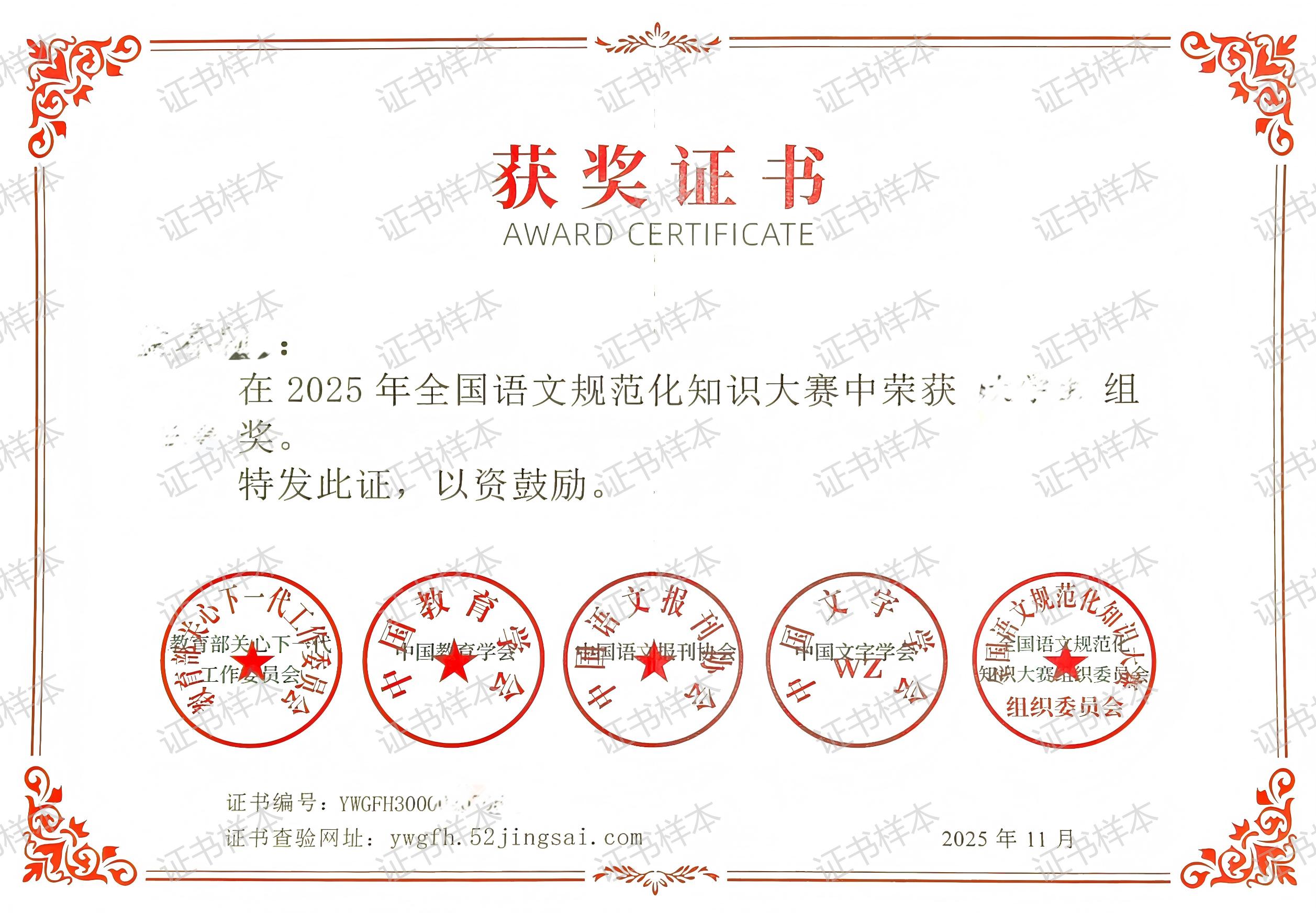 2026年第八届大学生语言文字能力大赛 报名时间:即日起至2026年6月5日下午5点 主办单位:中国语文报刊协会读写教学分会、 参与对象:全国在校大学生(包括研究生、本科生、高职高专学生,不限专业)。 获奖率: 省赛获奖率48%,均发荣誉证书;全国决赛获奖率48%,均发荣誉证书,全国决赛一等奖每组前三名,依次颁发奖金1000元、500元、200元(税前)。获奖学生/院校有机会在官方平台进行表彰。 推荐理由:大赛已被正式纳入中国高等教育学会发布的《全国普通高校学科竞赛排行榜》观察目录,高校教师教学发展研究国家级虚拟教研室等单位联合发布的《普通高校大学生中文类竞赛分析报告(2025版)》以及省教育厅和多所高校学科竞赛榜单。认可度高,含金量高,对大学生综测学分、评奖评优、简历提升都有帮助! 参赛链接:www.yywz.org.cn 往届证书样本 ![]() 2026年全国语文规范化知识大赛