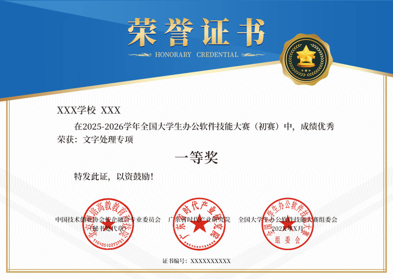 第三批次考试时间:2026年3月14日 第四批次考试时间:2026年4月25日 主办单位:中国技术创业协会校企融合专业委员会、广东省时代产业研究院 参赛对象 在校大学生(包括专科生,本科生及研究生),专业不限 大赛赛项 文字处理、电子表格、演示文稿(三科任选)