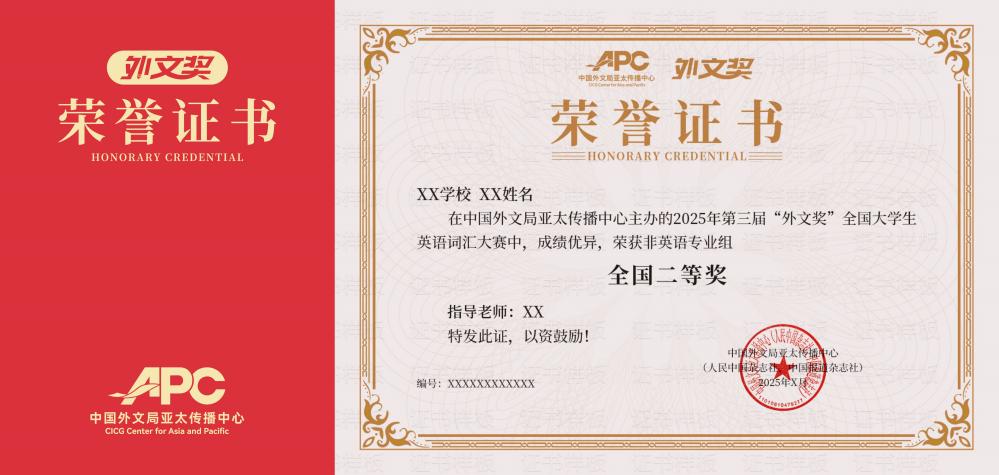 2026年第四届“外文奖”全国大学生英语词汇大赛 第一场报名截止时间:2026年4月24日 主办单位:中国外文局亚太传播中心(人民中国杂志社、中国报道杂志社) 参与对象: 全国在校及毕业五年内大学生(包括专科生、本科生及研究生),专业不限。 获奖率: 全国一等奖5%,全国二等奖15%,全国三等奖30%,所有获奖证书均颁发纸质版证书和电子版证书,参赛却未获奖者可获得电子版参赛证明。 若本场本组参赛人数大于等于800人,全国一等奖本组前三名将依次颁发奖金1000元、500元、200元(税前),同时额外奖励中国外文局亚太传播中心官方主办的英语实习训练营名额,完成实习任务可获得电子版实习证明、实践报告、实习鉴定表等服务。 推荐理由:含金量高,被多校纳入国家级/省部级学科竞赛认证层级,获奖学生可凭竞赛证书申请创新学分认定、奖学金评定及推免加分等专项支持。 往届证书样本 ![]()