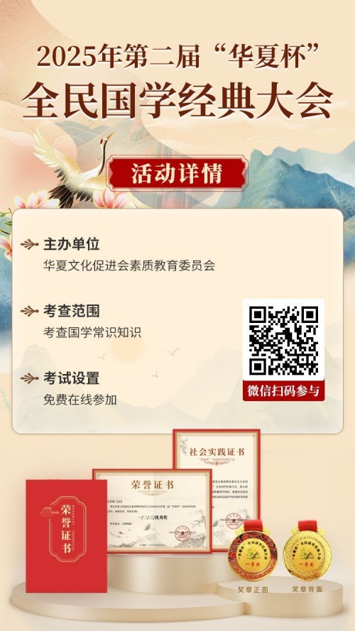 2025年“华夏杯”全民国学经典大会 免费知识答题!及格即可领取获奖证书+社会实践证书