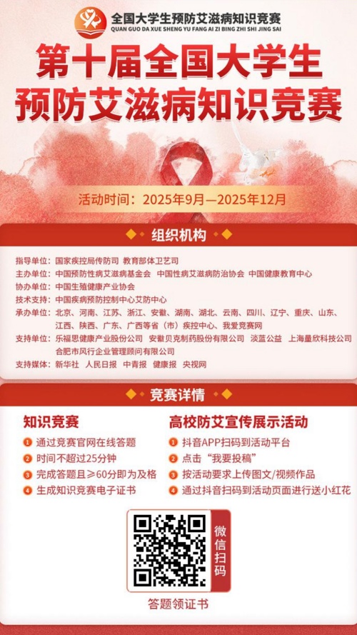 参赛时间:2025年9 月15日至12月15日 指导单位: 国家疾控局传防司、教育部体卫艺司 主办单位:中国预防性病艾滋病基金会、中国性病艾滋病防治协会、中国健康教育中心 题目随机从题库中抽取竞赛试题25道题。题目均是客观题。