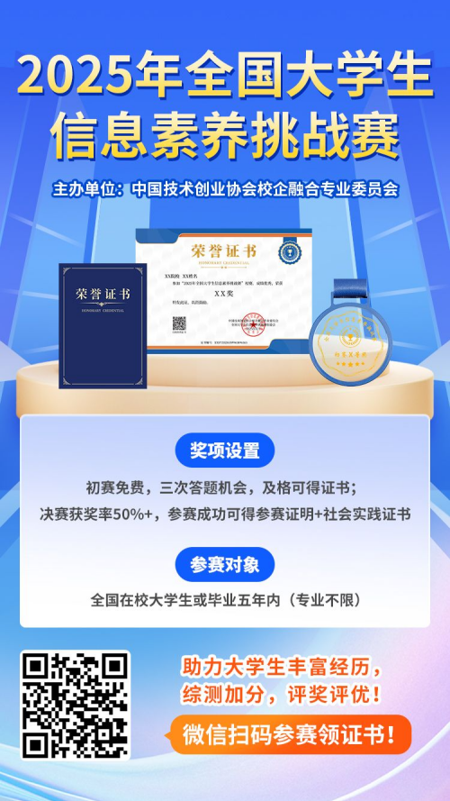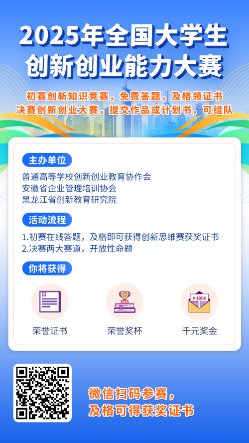 扫描上方海报二维码即可进入官网报名 2025年全国大学生创新创业能力大赛 初赛免费答题,助力创新学分!