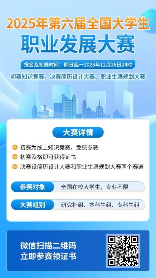 扫描上方海报二维码即可进入官网报名 2025年第六届全国大学生职业发展大赛 初赛知识竞赛,免费参赛拿证书