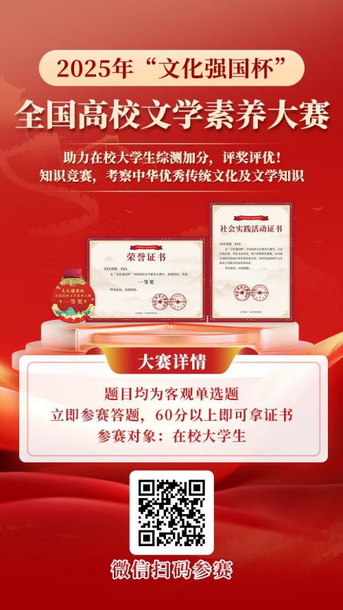 2025年“文化强国杯”全国高校文学素养大赛 助力综测,答题领证书