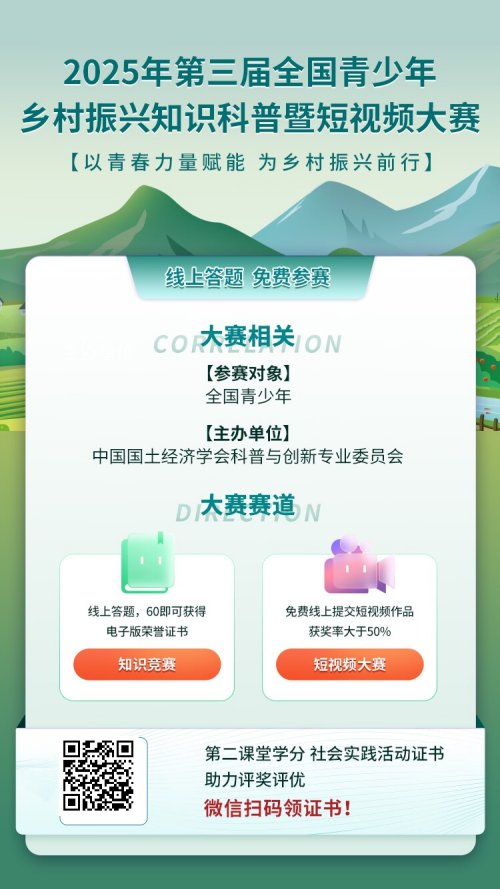 2025年第三届全国青少年乡村振兴 知识科普暨短视频大赛 助力综测评优,免费参赛领证书