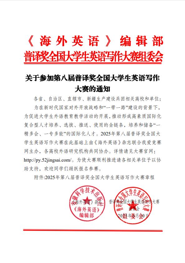 2025年第八届普译奖全国大学生英语写作大赛章程 一、大赛前言 在新时代国家对外开放战略和“一带一路”建设的背景下,为促进大学生外语教育教学活动的开展,推动形成高素质国际化复合型人才培养、选拔、推送、使用的全链条,培养和储备“一精多会、一专多能”的国际化人才,“普译奖”系列赛已成功举办九届普译奖全国大学生翻译比赛及七届普译奖全国大学生英语写作大赛。作为外语类品牌赛事,“普译奖”系列赛面向广大高校学生,受到了各高校及外语研习机构的广泛好评。2025年第八届普译奖全国大学生英语写作大赛在此基础上仍由《海外英语》杂志联合我爱竞赛网主办,各高校外语研究机构共同协办。 二、组织机构 主办单位:《海外英语》杂志 联合主办单位:我爱竞赛网 协办单位:(以下为部分往届协办单位,本届大赛持续招募中,以大赛官网为准) 北京物资学院 外语学院 淮阴工学院 外国语学院 西安石油大学 外国语学院 大连东软信息学院 外国语学院 重庆外语外事学院 英语学院 浙江科技学院 外国语学院 哈尔滨师范大学 西语学院 海南外国语职业学院 公共外语教研室 兰州博文科技学院 外国语学院 安阳工学院 黑龙江外国语学院 英语系 三、参赛对象 全国高校在校大学生(包括高职高专生,本科生及研究生) 四、大赛详情 (一)参赛流程 1.报名阶段:即日—12月4日9时 说明:登录大赛官网,注册并填写个人信息后报名,报名费40元。 2.参赛阶段:2025年11月28日9:00-12月4日17:00 说明:已报名选手登录官网,查看作文题目,并在比赛截止时间前提交作品。 3.评审阶段:2025年12月5日—12月20日 4.公示阶段:2025年12月20日15时 说明:大赛结果于12月20日15时在官网公布,各参赛选手登录官网查询。 5.颁奖阶段:2025年12月20日后 (二)赛题说明 根据所给题目及要求撰写一篇300-500词的英文文章。要求必须紧扣主题,语言通顺,用词得当,结构合理,文体恰当,具有说服力。 (三)参赛要求 在线写作,参赛期间可无限次修改保存提交,在截止时间前请务必提交。 (四)参赛费用 本次大赛收取费用40元/人,费用用于出题评审、大赛系统开发、交通、设备、获奖证书等。费用由技术支持单位合肥泡面网络科技有限公司代收代付并开具发票,学校有关部门要积极支持比赛工作,对指导教师在工作量、活动经费等方面给予必要的支持。 五、评审标准(参考) 说明: 1.为办好本届大赛,保证赛事的权威、公平、公正,大赛评审将对所有作文进行人工智能初审,接下来则由组委会和各高校协办单位的专业老师进行复审。最后由专家老师组成的大赛评审委员会负责参赛作品的终审工作。 2.参赛作品一经发现作弊情况(包含但不限于使用软件、抄袭、雷同、代写),即取消参赛者参评资格。 六、奖项设置 七、高校协办单位福利 (一)荣誉证书 1、颁发优秀协办单位荣誉牌匾,2-3本组委会专家聘书,3本优秀志愿者证书。(20人<本校参赛 人数<40人) 2、颁发优秀协办单位荣誉牌匾,3-5本组委会专家聘书,5本优秀志愿者证书。(40人<本校参赛 人数く60人) 3、颁发优秀协办单位荣誉牌匾,不低于5本组委会专家聘书,5本优秀志愿者证书且每增加20人(含) 增发1本优秀志愿者证书(累计不超过10本)。(本校参赛人数>60人) 说明:组委会专家聘书仅颁发给参与大赛评审工作的高校英语教师。 (二)组织经费 凡参与本次大赛协办的高校单位,通过本单位专属宣传链接报名的本校学生,依据该报名人数给予6 元/人的院校组织费补贴。 (三)评审费 凡参与本次大赛协办单位所在高校的教师参与作品评审的,给予该老师3元/篇作品评审费。 八、联系方式 联系人:龙老师 联系电话(微信):17333270604 大赛通知交流QQ群:点击加群(仅限参赛选手) 协办单位报名QQ群:点击加群(仅限老师或组织负责人) 大赛志愿者QQ群:点击加群 九、其他说明 1.参赛选手应秉持诚信态度,保证作文为本人原创,不得抄袭、作弊。接受实名举报,匿名举报无效。如经组委会查实有抄袭或作弊情况,将取消该选手参赛资格。 2.本次大赛所有投稿作品著作权归原作者所有;参赛作品版权归大赛组委会所有。参赛选手应妥善保存参赛作品,勿在报刊、网络等任何媒体或以任何方式公布,违者取消参赛资格(及奖项)且承担由此造成的一切后果。 3.本次大赛收取报名费40元/人,因大赛官网系统搭建、各项组织协调工作的开展,自2025年11月25日上午9时后概不受理退费。如因不可抗力因素造成赛事无法继续进行,大赛将自行终止。 本文信息搜集整理自互联网,信息版权及活动解释权归主办单位所有,我爱竞赛网仅作媒体支持。 我爱竞赛网赛事交流总群