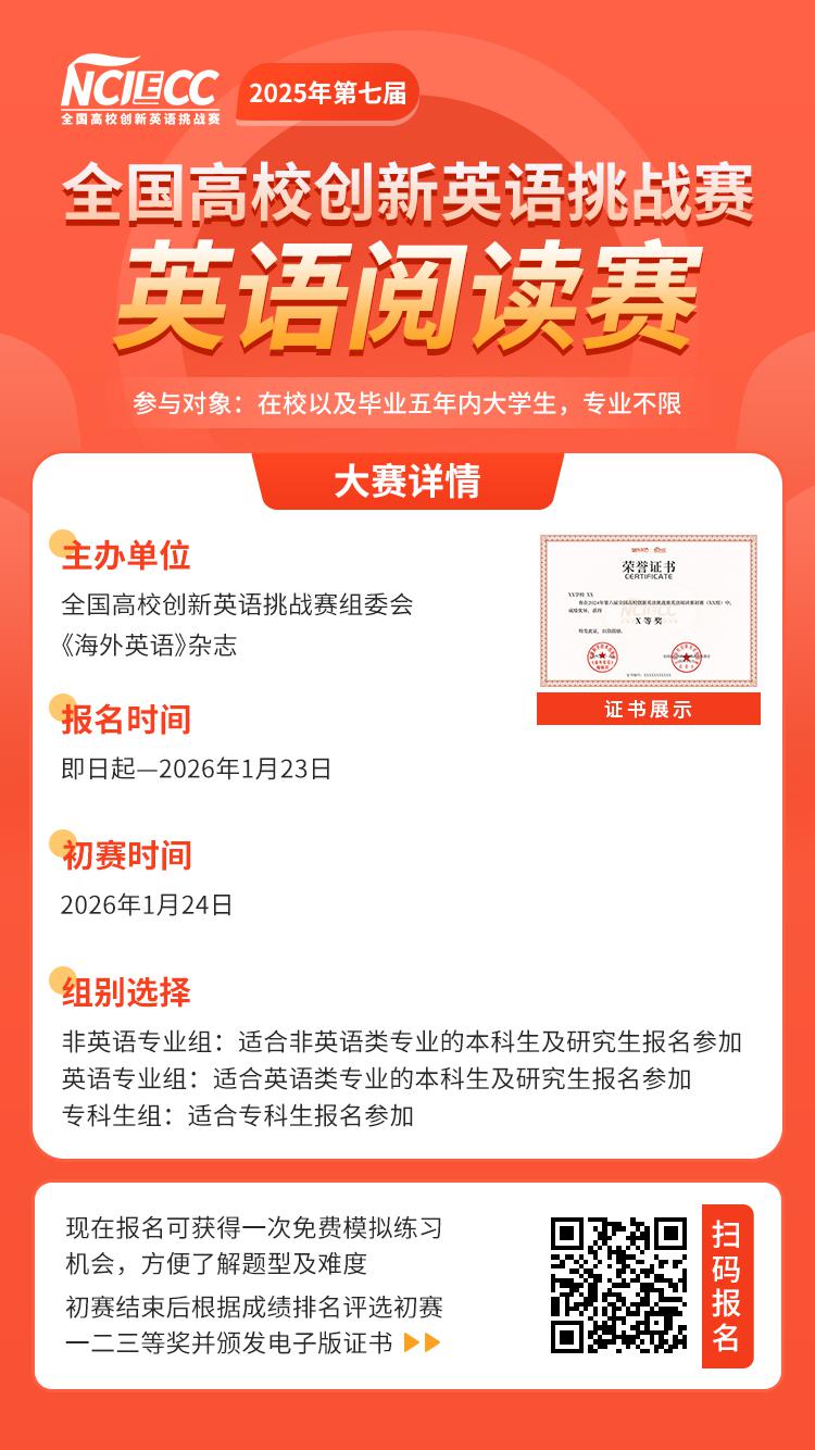 参赛者在报名成功后,可以有一次模拟答题机会(尽早报名,可早了解题型和准备)。初赛采用线上计算机闭卷答题和全程摄像监考形式,初赛为5篇阅读文章,共25道题目,满分100分,时长40分钟。