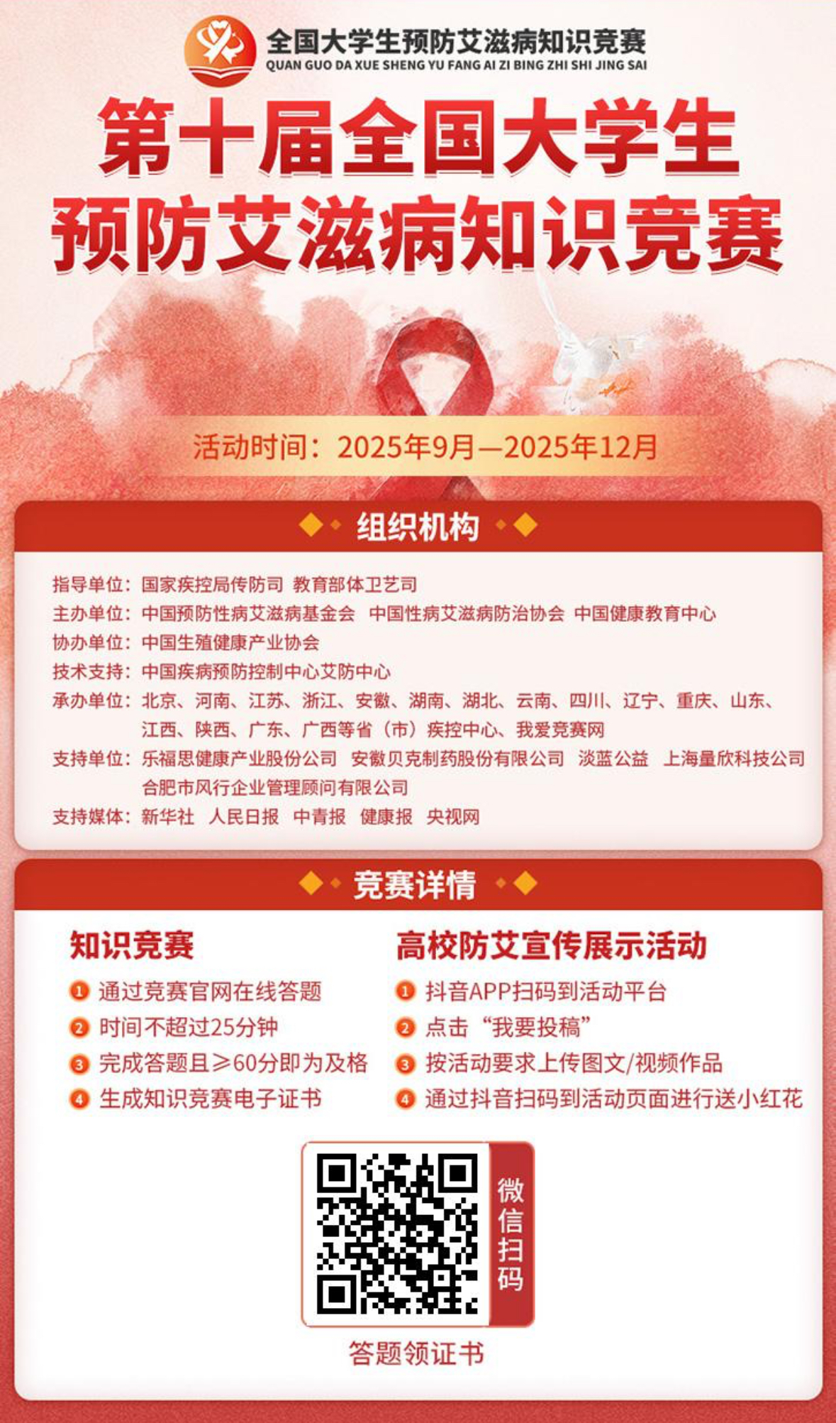 我爱竞赛网承办的第十届全国大学生预防艾滋病知识竞赛正式启动 启动仪式开场 9月20日,第十届全国大学生预防艾滋病知识竞赛启动仪式暨高校防艾宣传旗帜接力传递活动在河南省郑州市华北水利水电大学隆重举办。此次活动以“知艾防艾·共享健康”为主题,采用线上知识竞赛与线下校园宣传相结合的方式,旨在向全国大学生普及艾滋病防治知识,筑牢青年群体抵御艾滋病的思想防线,提升大学生群体健康素养,引导其养成科学文明的生活方式,为校园防艾工作增添新活力。 学生表演 国家疾病预防控制局传防司司长雷正龙,教育部体卫艺司卫生健康处处长、一级调研员樊泽民,中国预防性病艾滋病基金会理事长孙新华,中国性病艾滋病防治协会会长郝阳,中国健康教育中心副主任(主持工作)吴敬,中国疾病预防控制中心艾防中心副主任刘玉芬,中国生殖健康产业协会副会长兼秘书长李晓玉,河南省疾病预防控制局副局长刘心想,河南省教育厅体卫艺处处长舒卫方,华北水利水电大学副校长张志增,河南省疾病预防控制中心副主任赵东阳等领导和专家出席活动现场。来自北京、江苏、浙江、安徽、湖南、湖北、云南、四川、辽宁、重庆、山东、江西、陕西、广西等省(市/自治区)疾控局、疾控中心的负责艾防工作同志参会并代表本省接受传递旗帜。 本次竞赛活动设置线上知识答题、旗帜百校接力传递、高校社团主题活动三大联动板块,构建了完整的高校防艾宣传矩阵。线上板块聚焦“百万人知识答题”,内容涵盖艾滋病防治核心知识,并融入青春期生殖健康教育,助力大学生系统掌握防艾健康防护要点。线下板块亮点纷呈,既有安全套免费发放、华北水利水电大学学生社团才艺表演等活动环节,也有专家座谈分享、有奖问答互动等深度交流。 主办方计划在2025年12月1日第38个世界艾滋病日前夕,结合今年世界艾滋病日主题宣传对全年知识竞赛的成果进行集中总结与展示,持续扩大校园防艾宣传影响力。 当前,全球艾滋病防治形势严峻,青年群体仍是“关键阵地“。联合国艾滋病规划署2024年发布的报告显示,2023年全球新增HIV感染病例130万例。其中,15至24岁青年女性群体每周新增病例即约4000例。在我国,青年学生群体防艾形势同样不容懈怠,15-24岁人群新发感染中,同性传播占比高达81%。这一系列数据既反映出青年群体对防艾知识的认知仍需深化,更警示校园防艾教育的针对性、实效性亟待加强。 大学生作为社会最具活力和创造力的群体,是社会发展的中坚力量,也是推动防艾事业向前的“青春引擎”。雷正龙司长在活动中强调,希望广大青年学子将防艾理念融入日常生活,以本次竞赛为契机强化知识储备,主动学习防艾知识、关爱受影响群体,用文明的生活方式、负责的交往态度,守护自身与他人健康。 樊泽民处长致辞 樊泽民处长在致辞中表示:“青春因健康而精彩,人生因责任而厚重”。一直以来,青年学生群体都是艾滋病防控工作的重点关注对象。随着社交方式多元化、婚恋观念变化,部分学生存在防艾知识盲区、自我保护意识薄弱等问题。校园防艾教育需在深入性、精准性、有效性上持续发力,进一步贴近青年需求。他期待以此次活动为契机,让防艾旗帜在更多校园飘扬,让健康理念深入更多青年心中,推动形成“校校有行动、生生懂防艾”的良好氛围。 孙新华理事长宣读倡议书 启动仪式上,孙新华理事长宣读倡议书,向全国高校师生发出号召:积极参与艾滋病防治知识学习,主动投身校园防艾公益活动,争做防艾知识的传播者、健康文明的践行者、消除歧视的倡导者,让“理解、包容、支持”成为社会对防艾工作的共同态度,凝聚起校园防艾的强大合力。 张志增副校长致欢迎词 张志增副校长在致欢迎辞环节中表示将以此次活动为契机,进一步加强与社会各界的合作,深化校园防艾宣传教育,强化学生的责任意识,守护学生的健康安全。 学生与专家答题互动 在互动问答环节,现场学生踊跃参与防艾问题作答,气氛热烈。中国疾病预防控制中心艾防中心副主任刘玉芬等专家结合学生回答进行专业点评与细致讲解,将防艾知识融入互动交流,帮助学生更生动透彻地理解艾滋病防治要点,深度契合了华北水利水电大学浓厚的学习氛围。 授旗仪式 本届活动还特别增加了授旗仪式,将防艾宣传旗帜传递给16省(市/自治区)疾控体系代表,以期促动青年人以行践知,从防艾知识的“被动学习者”转变为“主动传播者”。 第十届全国大学生预防艾滋病知识竞赛启动 据悉,第十届全国大学生预防艾滋病知识竞赛由中国预防性病艾滋病基金会、中国性病艾滋病防治协会、中国健康教育中心联合主办,中国生殖健康产业协会协办,16省(市/自治区)疾控中心、我爱竞赛网等单位共同承办。 全国大学生预防艾滋病知识竞赛覆盖全国高校,始创于2016年,2022年被国务院防治艾滋病工作委员会办公室纳入“世界艾滋病日”主题宣传活动推荐公益项目。自首届竞赛启动以来,竞赛活动始终秉持“预防为主·教育为先”理念,紧跟国家防艾策略与部署,不断探索校园防艾教育新路径、新模式,让防艾公益火种在高校持续传递。 截至目前,全国大学生预防艾滋病知识竞赛活动累计吸引1905万人次大学生参与,覆盖高校6950所次,动员校内社团9973个次,已成为高校中具有广泛影响力的防艾公益品牌活