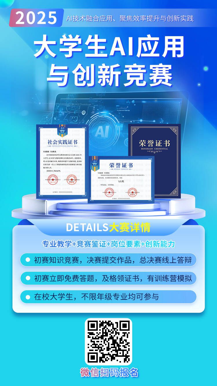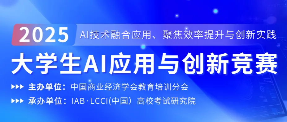 为深入贯彻中共中央、国务院《教育强国建设规划纲要(2024—2035年)》“完善拔尖创新人才发现和培养机制”工作部署,全面落实教育部等九部门《关于加快推进教育数字化的意见》(教办〔2025〕3号)“以师生为重点提升全民数字素养与技能”发展要求,积极响应教育部“双千”计划,推动高等教育人才培养供需适配,培育新质生产力发展新动能。中国商业经济学会教育培训分会全面推进“人工智能+创新服务业发展新模式”行动深度融合,拟于2025年9月至2026年1月举办首届大学生AI应用与创新竞赛。
