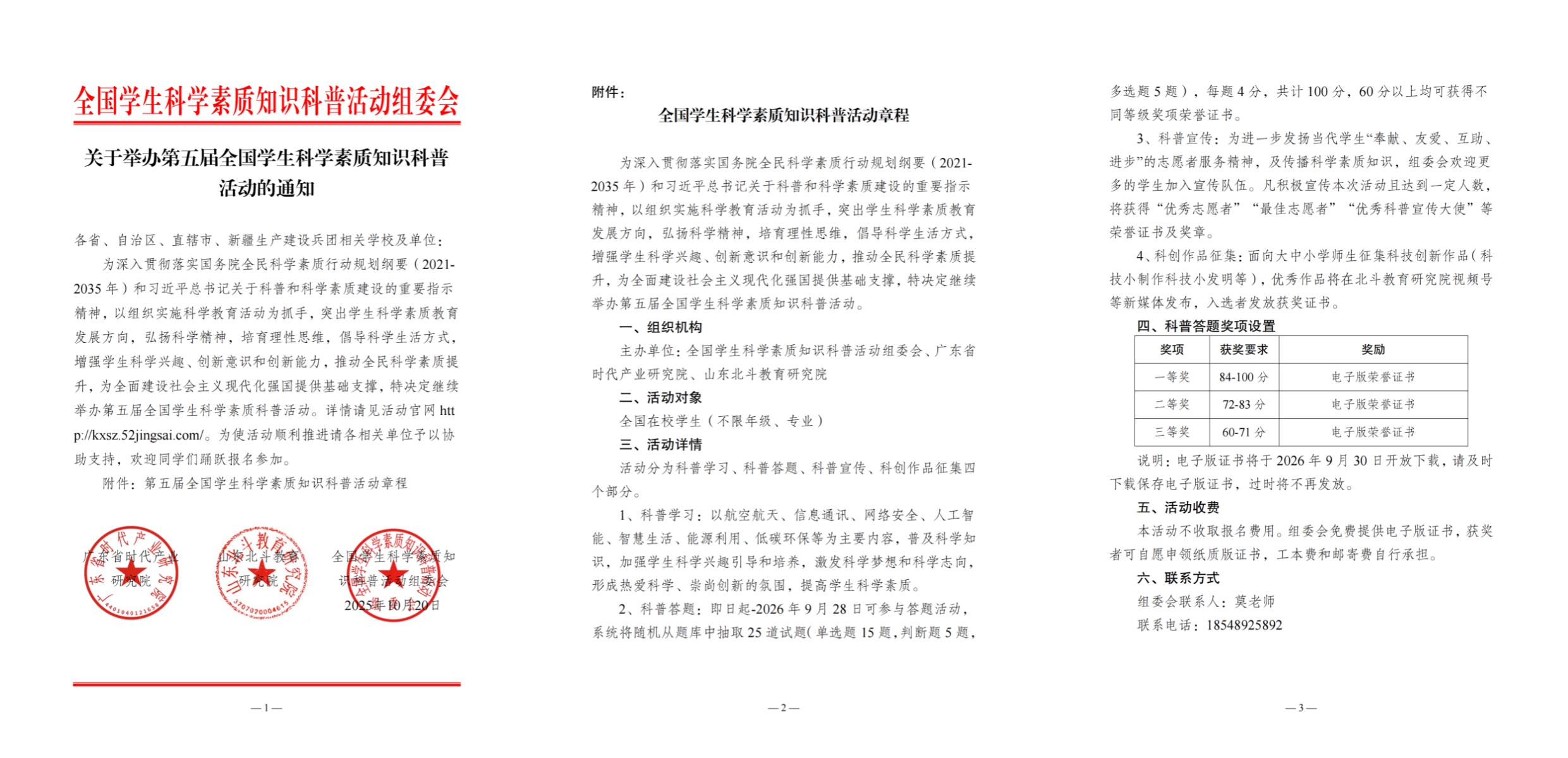 3、科普宣传:为进一步发扬当代学生“奉献、友爱、互助、进步”的志愿者服务精神,及传播科学素质知识,组委会欢迎更多的学生加入宣传队伍。凡积极宣传本次活动且达到一定人数,将获得“优秀志愿者”“最佳志愿者”“优秀科普宣传大使”等荣誉证书及奖章。
