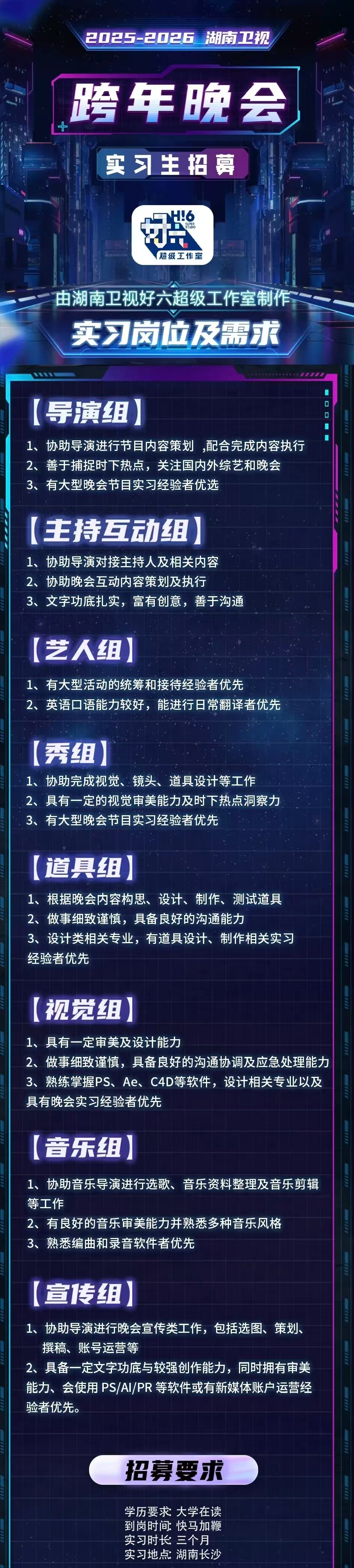 【湖南卫视跨年晚会】实习生招募! 关注“大学生志愿者信息” 回复“523”即可报名 本文信息搜集整理自互联网,信息版权及活动解释权归主办单位所有,我爱竞赛网仅作媒体支持。 请仔细看正文,正文里有报名办法,或者报名官网。