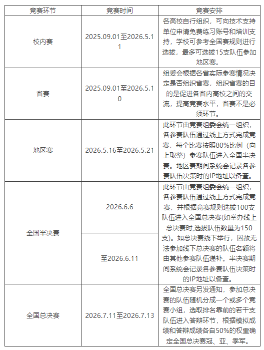 4.全国赛赛程分为校内赛、地区赛、全国半决赛、全国总决赛4个环节。校内赛由各学校参照全国赛规则自行进行选拔。有条件的省(市)可以根据参赛院校情况决定是否组织省(市)赛,省(市)赛为交流赛,非必要环节。