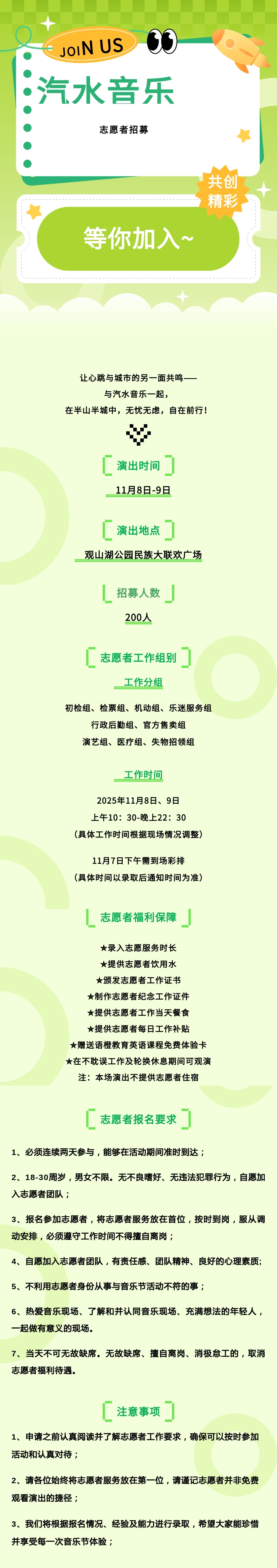 汽水音乐节CHILL派对志愿者招募 关注“大学生志愿者信息” 回复“529”即可报名 本文信息搜集整理自互联网,信息版权及活动解释权归主办单位所有,我爱竞赛网仅作媒体支持。 请仔细看正文,正文里有报名办法,或者报名官网。