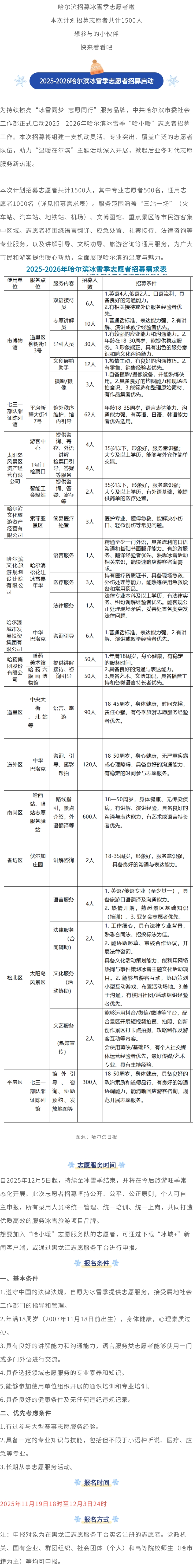 2025—2026哈尔滨冰雪季志愿者招募 报名方式 关注“大学生志愿者信息” 回复“544”即可报名 本文信息搜集整理自互联网,信息版权及活动解释权归主办单位所有,我爱竞赛网仅作媒体支持。 请仔细看正文,正文里有报名办法,或者报名官网。