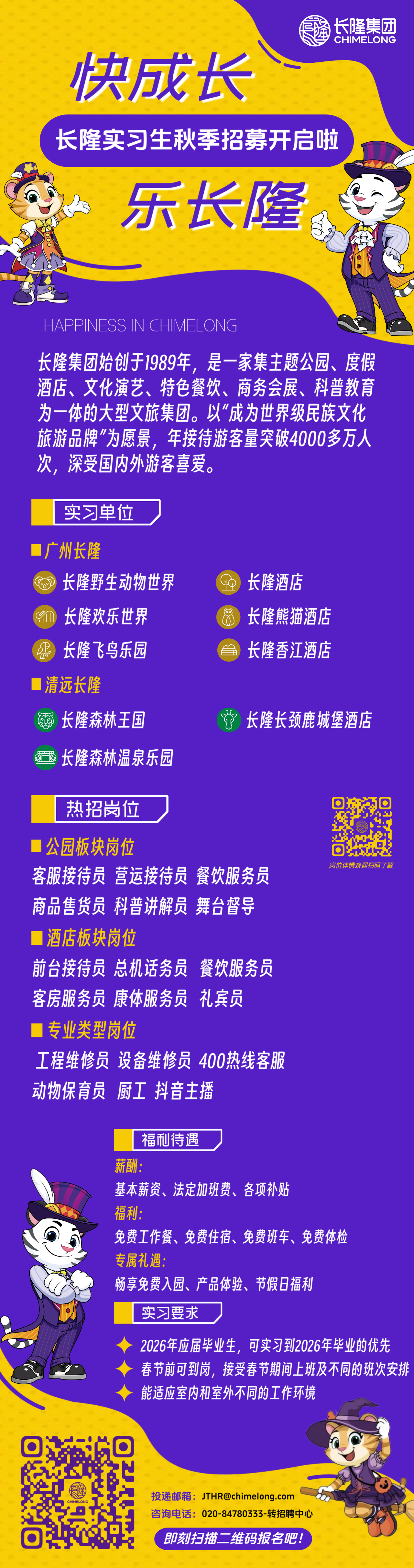 长隆实习生招聘 投递邮箱:JTHR@chimelong.com 本文信息搜集整理自互联网,信息版权及活动解释权归主办单位所有,我爱竞赛网仅作媒体支持。 请仔细看正文,正文里有报名办法,或者报名官网。