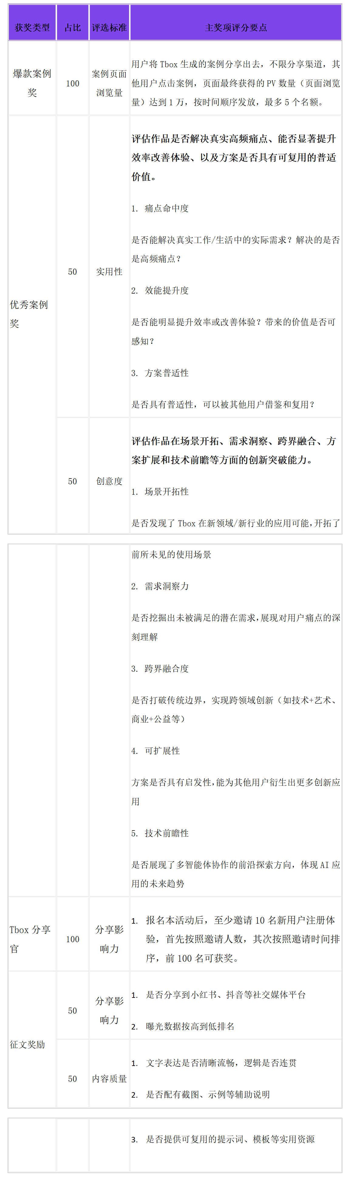 3.【爆款案例奖】特别说明:用户分享Tbox案例,当分享链接被点击,累计PV量达到10,000,即可参与评选。百宝箱Tbox官方评为团队将依据PV量由高到低,选取排名前5的案例予以奖励。百宝箱Tbox官方将严格审核数据,排除恶意刷量。