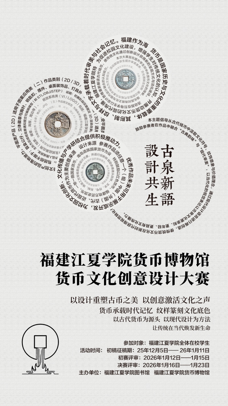 货币是国家历史与文化的重要载体,其形制、纹样与文字承载着时代审美与社会记忆。福建作为海上丝绸之路的重要区域,拥有丰富的地方货币文化资源。为促进校园文化建设,增强学生对传统文化的认知,并推动货币文化的现代传播,福建江夏学院货币博物馆特举办“古泉新语·设计共生”货币文化创意设计大赛。活动旨在引导学生以设计思维重新解读古代钱币,使传统文化通过创新设计获得新的呈现方式与活化途径。