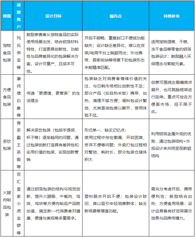我们期待参赛者能够充分发挥创新思维与跨界设计能力,以铝箔包装性能优势为载体,从消费者和品牌方视角出发,深入洞察、分析所选择赛题的痛难盲点,巧妙融合。借助各类工具,创造具有实用性、个性化、美观、落地性与可持续的铝箔包装,为中国食品行业的高质量发展贡献智慧与灵感。