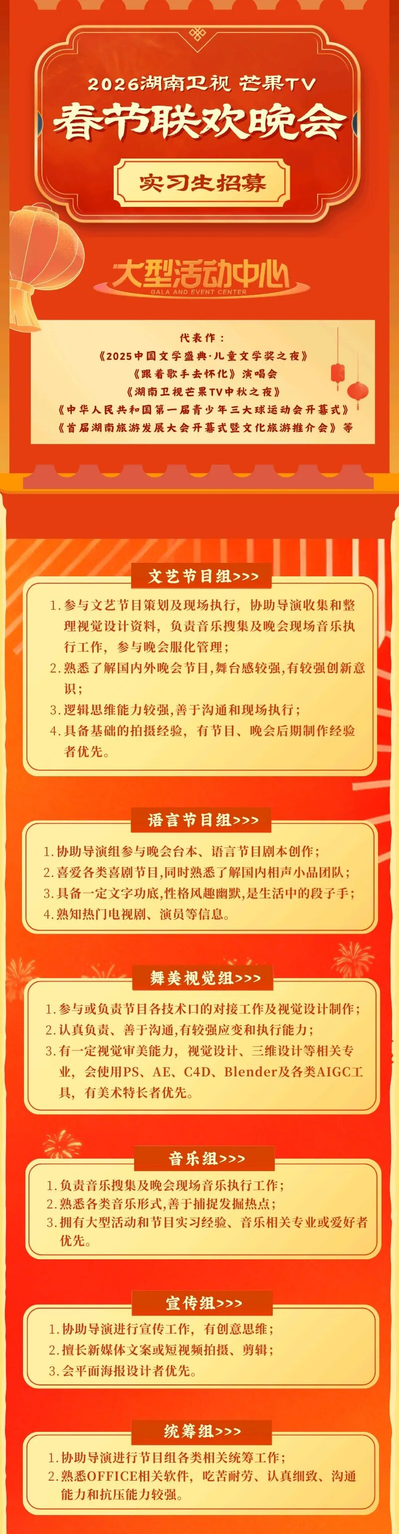 《2026湖南卫视、芒果TV春节联欢晚会》实习生招募令 报名方式 关注“大学生志愿者信息” 回复“555”即可报名 招募要求 01、学历要求:大学在读 02、到岗时间:快马加鞭 03、实习时长:三个月 04、实习地点:湖南长沙 报名方式 关注“大学生志愿者信息” 回复“555”即可报名 本文信息搜集整理自互联网,信息版权及活动解释权归主办单位所有,我爱竞赛网仅作媒体支持。 请仔细看正文,正文里有报名办法,或者报名官网。