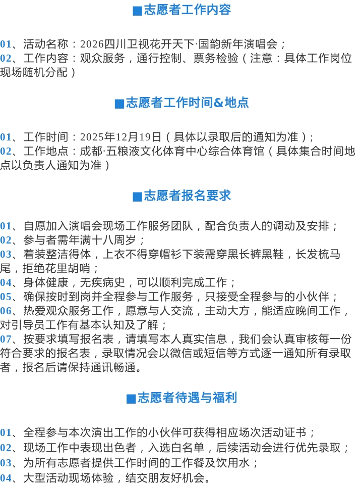 2026四川卫视花开天下·国韵新年演唱会志愿者招募 关注“大学生志愿者信息” 回复“556”即可报名 本文信息搜集整理自互联网,信息版权及活动解释权归主办单位所有,我爱竞赛网仅作媒体支持。 请仔细看正文,正文里有报名办法,或者报名官网。