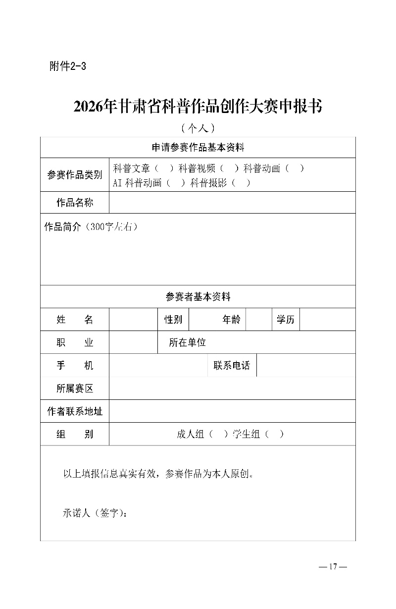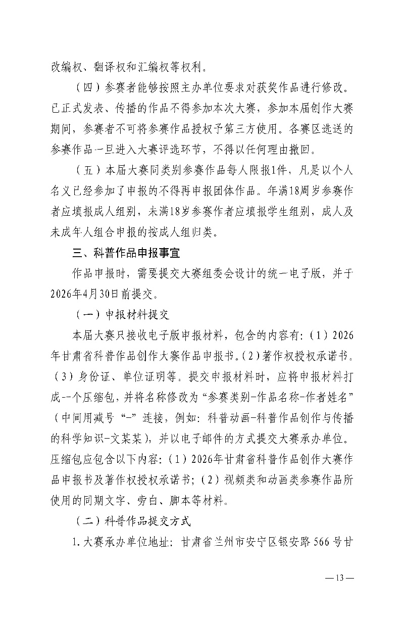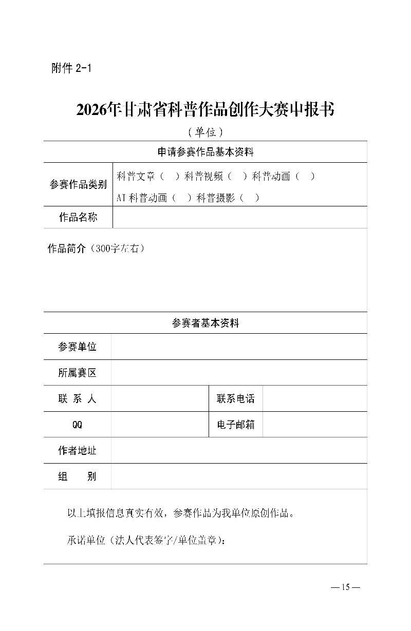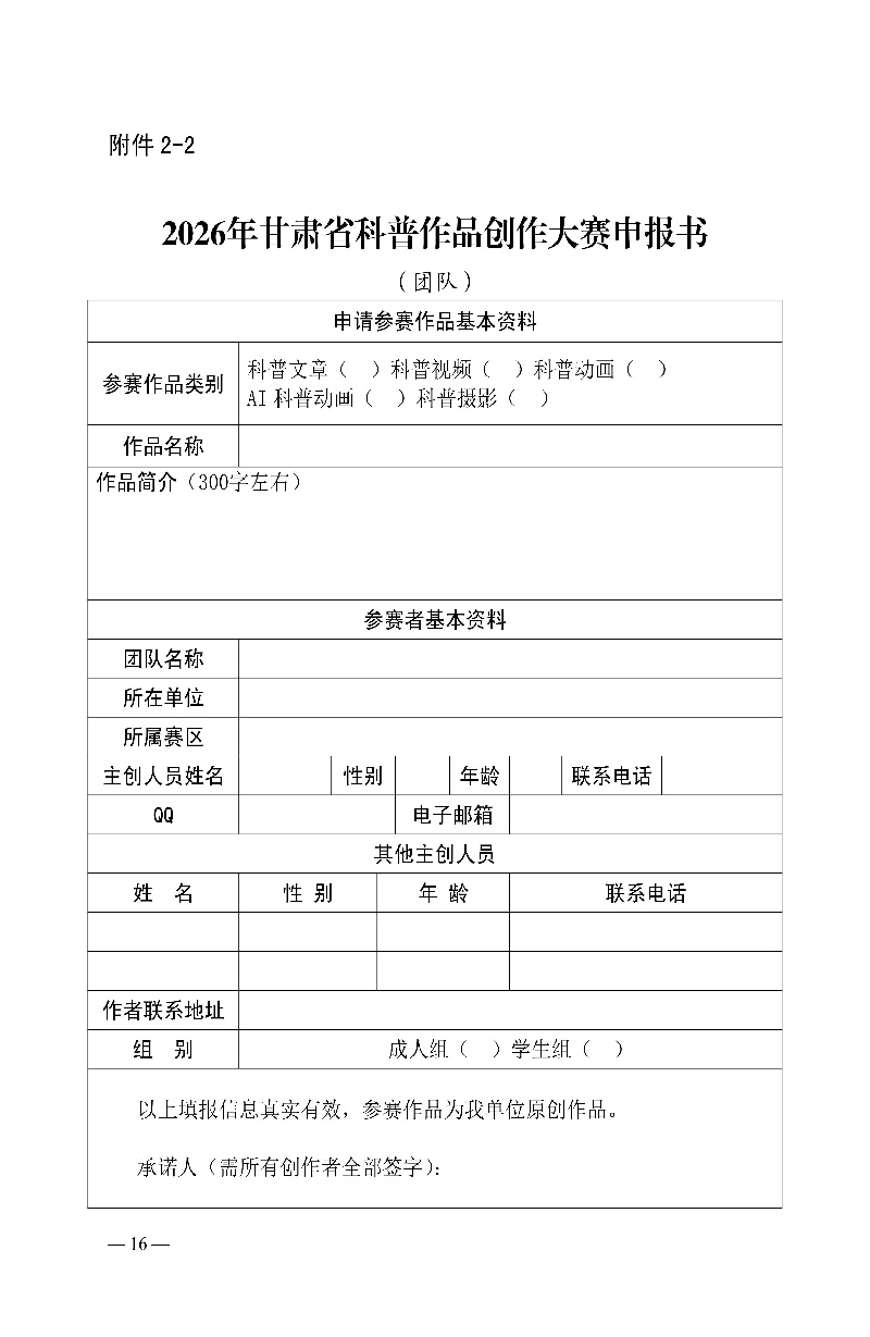 作品申报截止日期:2026年4月30日 附件2-1:2026年甘肃省科普作品创作大赛申报书(单位).docx 附件2-2:2026年甘肃省科普作品创作大赛申报书(团队).docx 本文信息搜集整理自互联网,信息版权及活动解释权归主办单位所有,我爱竞赛网仅作媒体支持。 请仔细看正文,正文里有报名办法,或者报名官网。