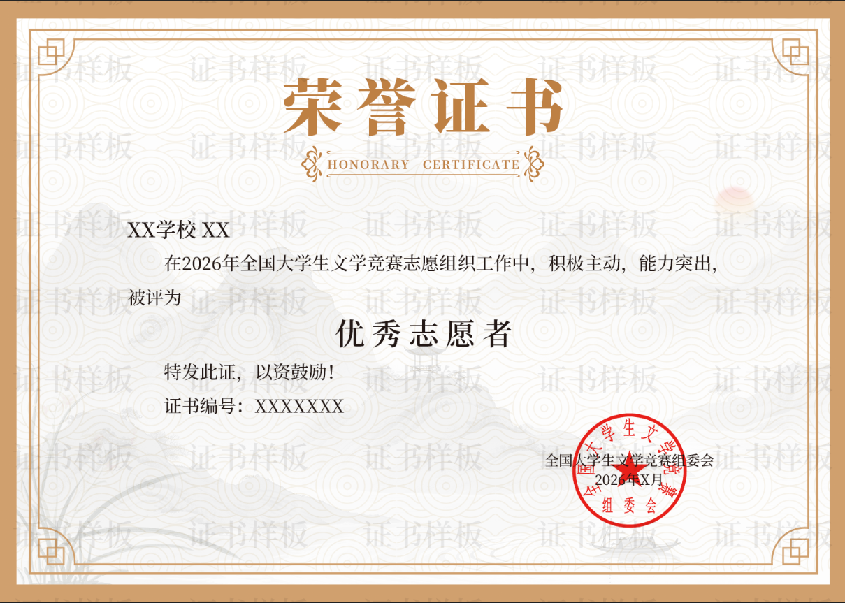 2026年全国大学生文学竞赛志愿者招募 截止时间:2026年7月30日 志愿者福利一: 下载所给的专属海报或者自制图文/视频将比赛推广至抖音/小红书/快手任一平台,并带上话题 #全国大学生文学竞赛 #文学竞赛 #大学生竞赛,内容须设为公开,集满5个赞以后将链接和截图提交到志愿者页面,审核时间为10个工作日,审核期间删除不予发放奖励,审核通过后可在志愿者页面下载电子版合格志愿者证书。 注意:请集满5个赞以后再提交审核材料,否则直接驳回。 志愿者福利二: 成功邀请2人完成答题,可立即下载电子版证书(需答题及格); 成功邀请5人完成答题,即可下载电子版优秀志愿者证书; 成功邀请15人完成答题,可获得纸质版优秀志愿者证书(免费邮寄); 成功邀请30人完成答题,可获得纸质版获奖证书和优秀志愿者证书(免费邮寄); 成功邀请50人完成答题,可获得纸质版获奖证书、纸质版优秀志愿者证书和优秀志愿者奖章(免费邮寄); 排列志愿者邀请人数前10名者,可获得纸质版获奖证书、纸质版优秀志愿者证书、优秀志愿者奖章及奖品。(免费邮寄) 注: 第一批纸质版志愿者证书填写邮寄地址时间为:2026年4月29日。 第二批纸质版志愿者证书填写邮寄地址时间为:2026年7月31日。 我爱竞赛网赛事交流总群