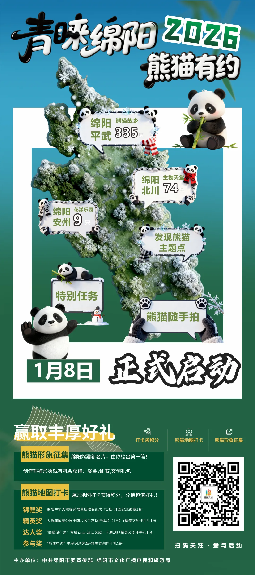 参与社交平台话题转发还能赚额外积分,季度排名靠前就能抱走绵阳中华大熊猫苑限量版联名纪念卡、生态巡护体验、文旅一卡通、精美文创伴手礼等好礼,奖品可邮寄~