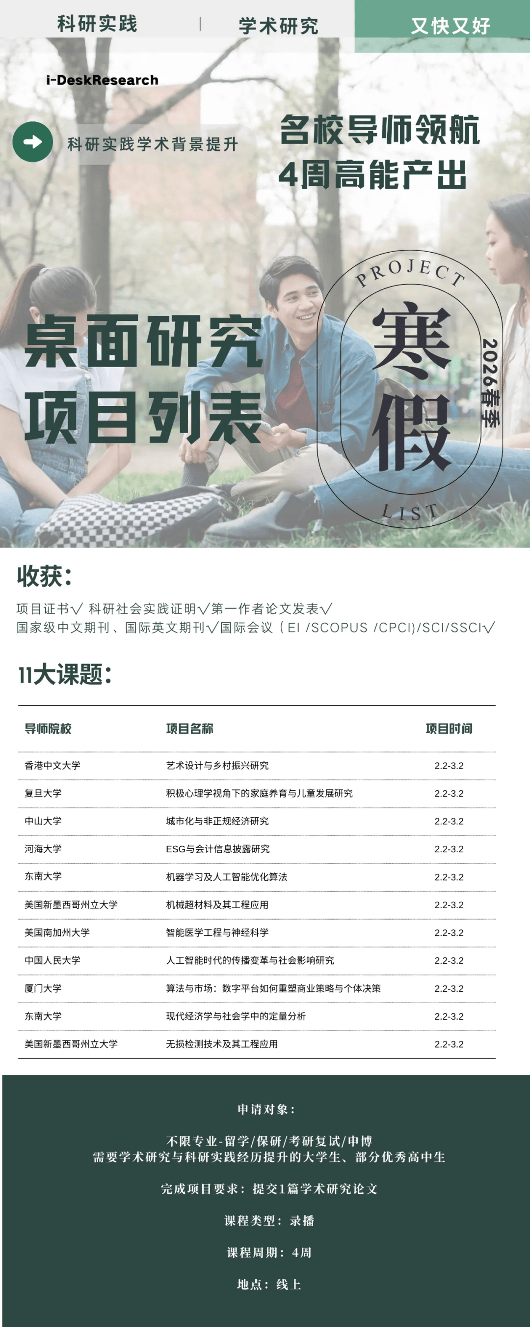 报名截止时间:2026年2月1日中午12:00(北京时间)桌面研究科研实践是一项专为卓有远见的学生和早期研究者量身定制的线上科研实践平台,项目汇集了全球高等教育界的教授/学术精英,旨在引导学生们独立完成一篇科研论文,充分实践科学探究和学术论述的全过程。项目已实施六年,获得了参与学生的广泛好评,适合需要学术研究经历背景提升的学生(考研、保研、留学、申博等)、国际高中生,具有又快又好的优势。项目结束后颁发结业证书、社会实践证明,有需要发表论文的同学也可以很快将研究成果发表,符合发表条件的同学论文可以以第一作者身份发表在国家级中文期刊、国际英文期刊或国际会议(CPCI、EI、SCOPUS)以及SCI/SSCI期刊上。What can you gain from this project 1、一份可写进简历独特的科研实践经历:将社会热点话题融入学术研究,收获更加深度的看问题视角,不仅得到知识的积累,也是一次独特的研究经历。2、一份体现研究经历的中、英文项目证书:由i-DeskResearch项目组、(香港)大中华地区青年交流中心(GCYEC)联合颁发的中、英文项目证书