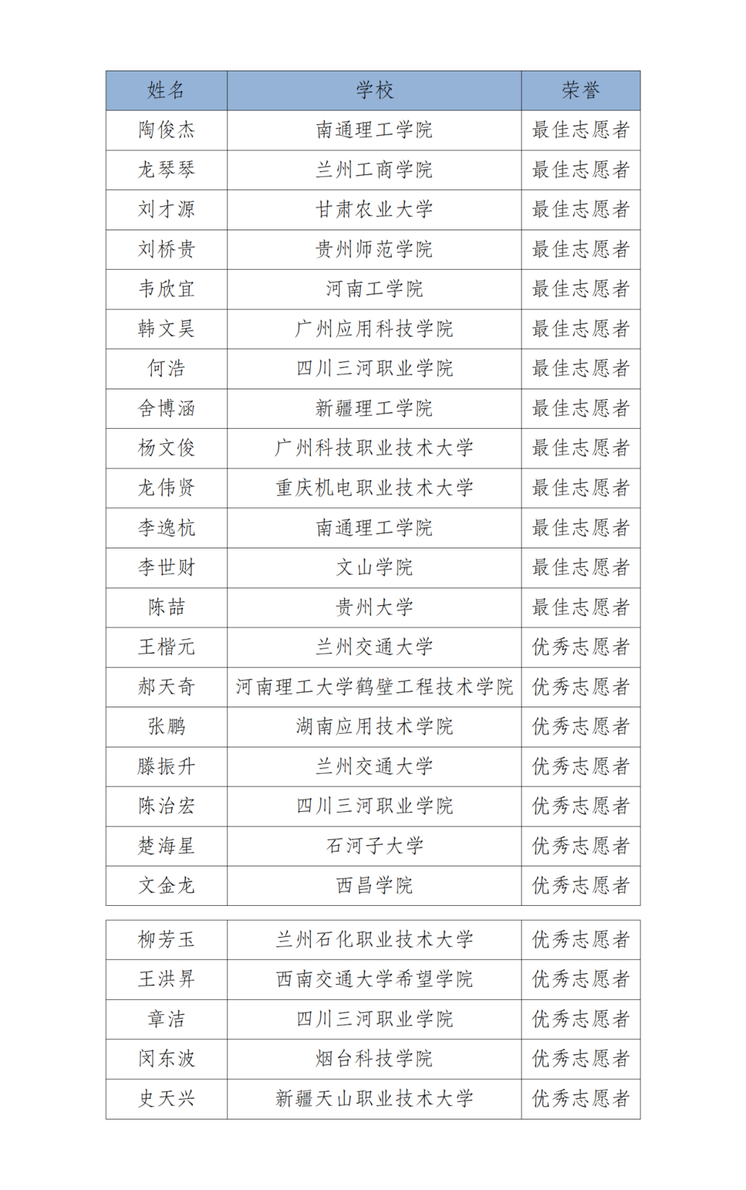 【志愿者表彰】2025年第七届全国高校计算机能力挑战赛 大赛官网 2025年第七届全国高校计算机能力挑战赛已于2025年12月7日圆满结束,共有300多位学生参加志愿服务工作,竞赛的顺利举办离不开各位志愿者的支持协助,大赛组委会在此衷心感谢所有参与志愿服务的人员。经大赛组委会评选审议,对在本次志愿服务工作中表现突出的部分优秀志愿者进行表彰,具体名单如下: 💓感谢各位志愿者的辛勤付出!已填写地址的志愿者证书&礼品会在本周内寄出~寄出后可在志愿者页面查看快递单号。请注意查收~🎁 我爱竞赛网赛事交流总群
