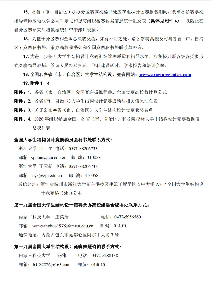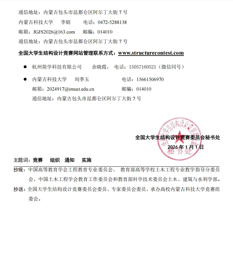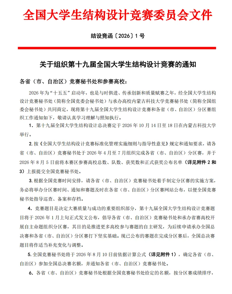 2026 年为“十五五”启动年,也是与时俱进、传承创新和质量赋赛之年, 经全国大学生结构设计竞赛秘书处(简称全国竞委会秘书处)与承办高校内蒙古科技大学竞赛秘书处(简称全国组委会秘书处)共同商定,现将第十九届全国大学生结构设计竞赛和各省(市、自治区)分区赛组织工作通知如下,敬请认真学习理解与照知执行。