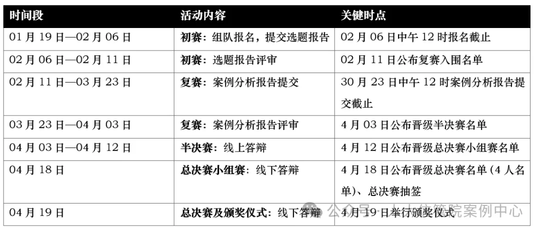 本次大赛共分为五个赛段——初赛、复赛、半决赛、总决赛小组赛以及总决赛。时间安排如下:
