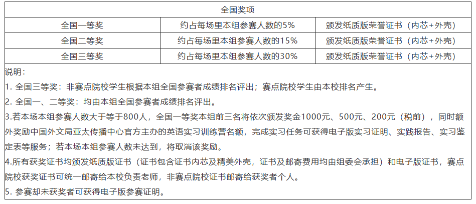 3.若本场本组参赛人数大于等于800人,全国一等奖本组前三名将依次颁发奖金1000元、500元、200元(税前),同时额外奖励中国外文局亚太传播中心官方主办的英语实习训练营名额,完成实习任务可获得电子版实习证明、实践报告、实习鉴定表等服务;若本场本组参赛人数未达到,将取消该奖励。
