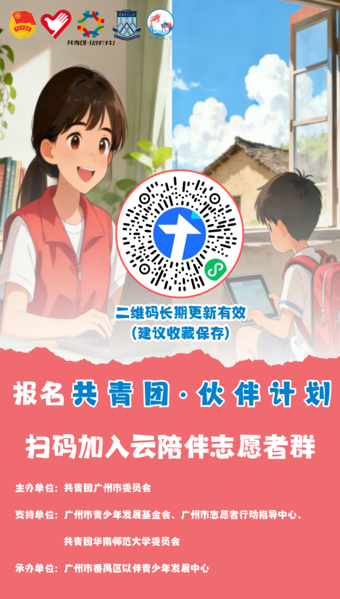 如果您愿意陪伴孩子们度过一个充实假期,如果您愿意用自己的力量帮助新就业群体子女,快来加入“共青团·伙伴计划”爱心托管项目吧。 按照共青团中央《“共青团·伙伴计划”实施方案》有关要求,在共青团广州市委员会统筹指导下,广州市青少年发展基金会、广州市志愿者行动指导中心等单位开设寒假爱心托管班,重点面向网约配送员、快递员、网约车司机、货车司机等新就业群体6-12岁未成年子女,现面向全国高校优秀学子招募志愿者。