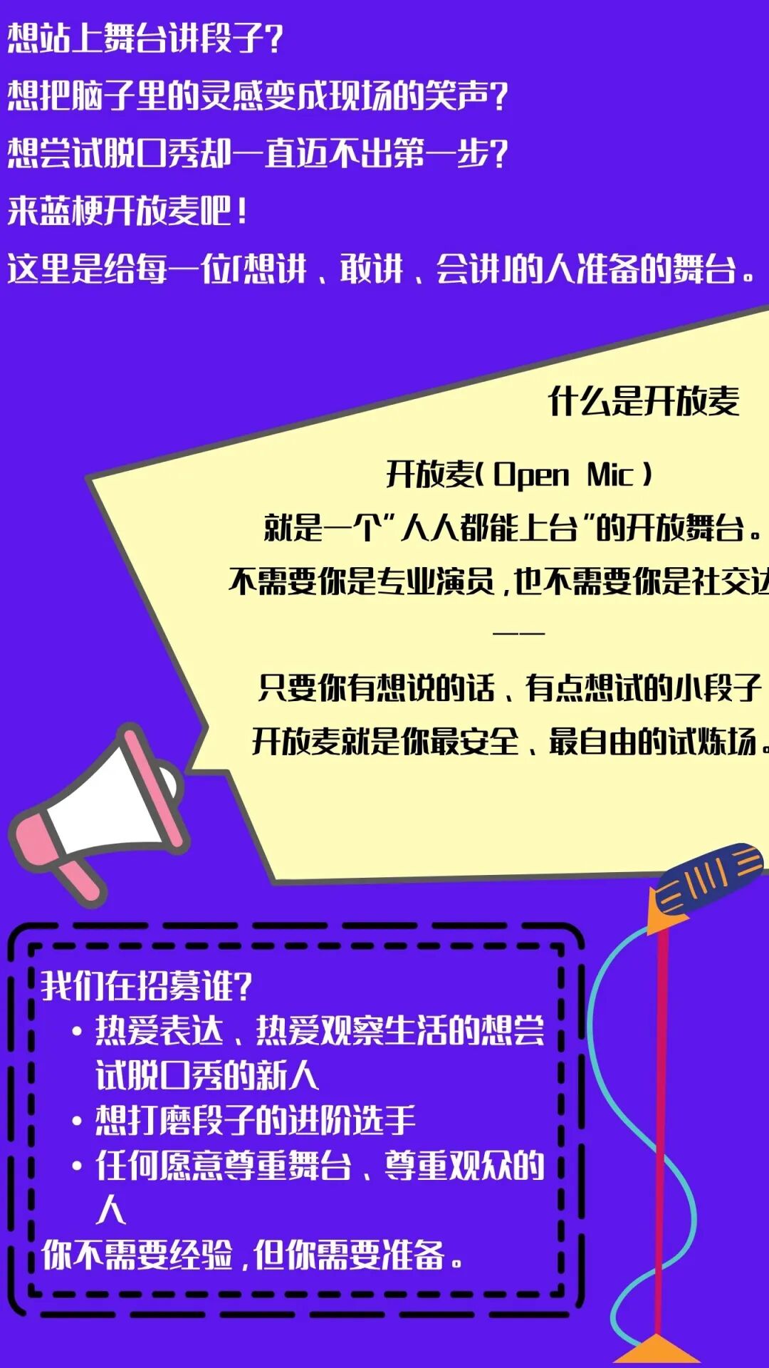 蓝梗喜剧开放麦演员招募 本文信息搜集整理自互联网,信息版权及活动解释权归主办单位所有,我爱竞赛网仅作媒体支持。 请仔细看正文,正文里有报名办法,或者报名官网。