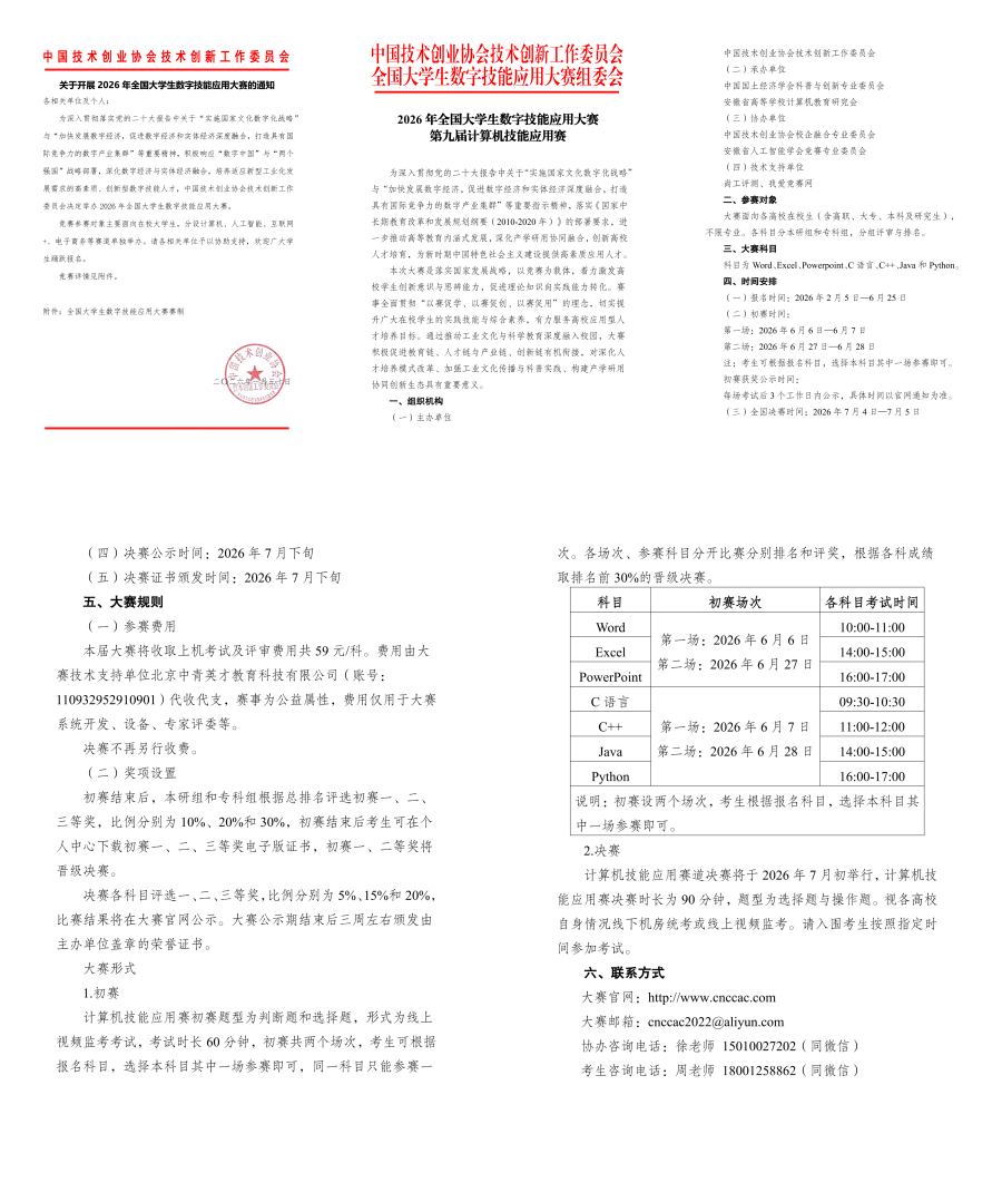 计算机技能应用赛道决赛将于2026年7月初举行,计算机技能应用赛决赛时长为90分钟,题型为选择题与操作题。视各高校自身情况线下机房统考或线上视频监考。请入围考生按照指定时间参加考试