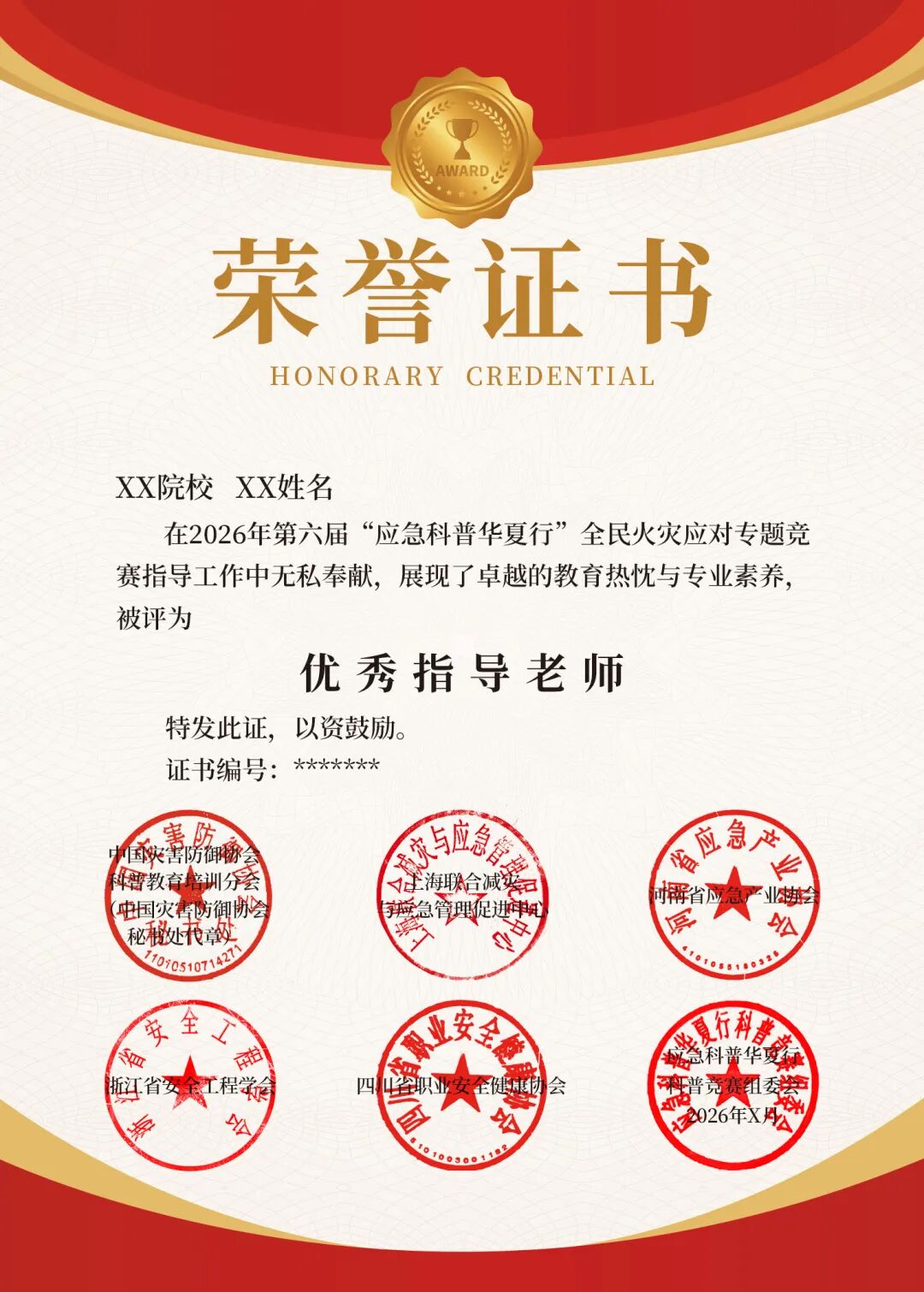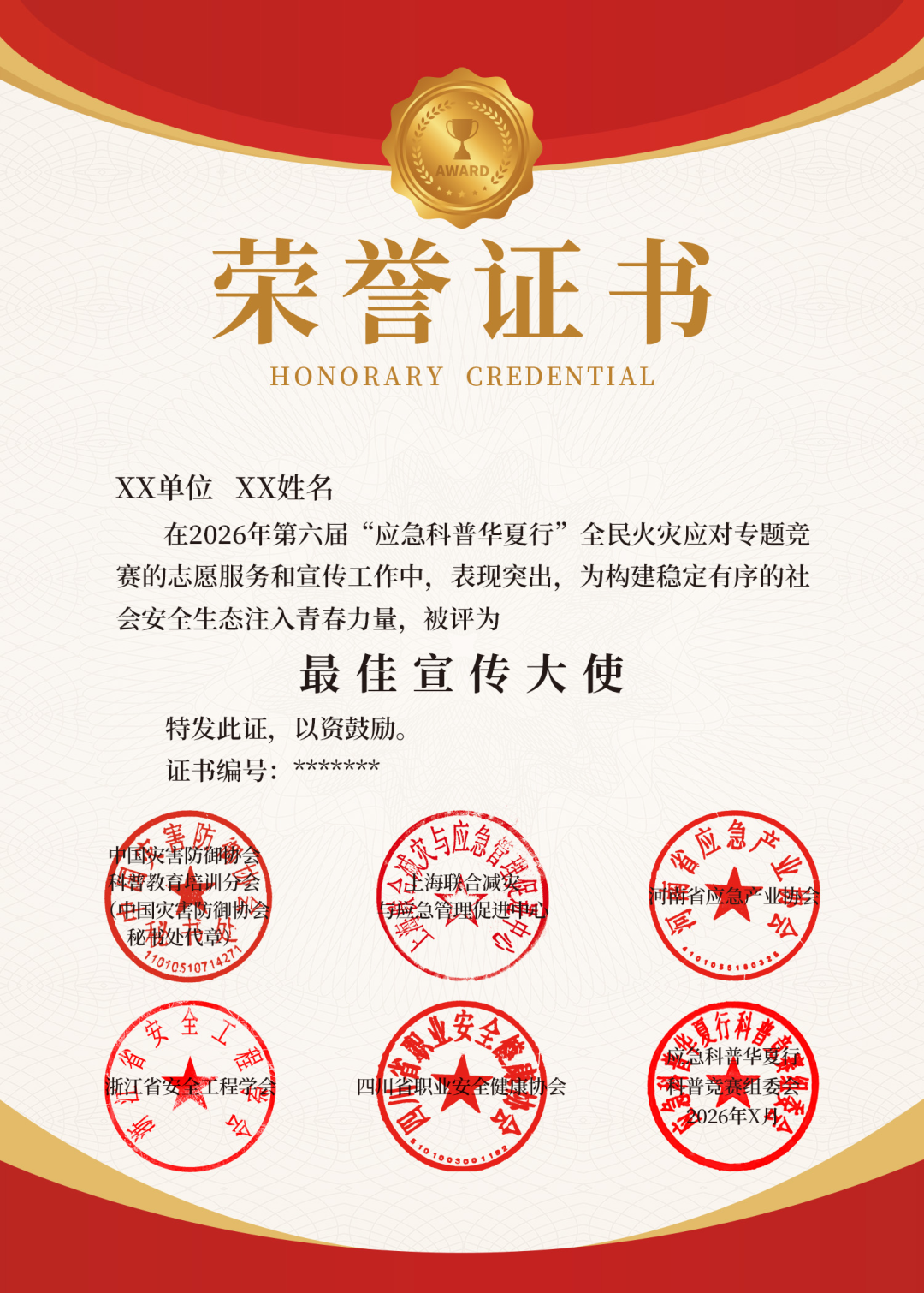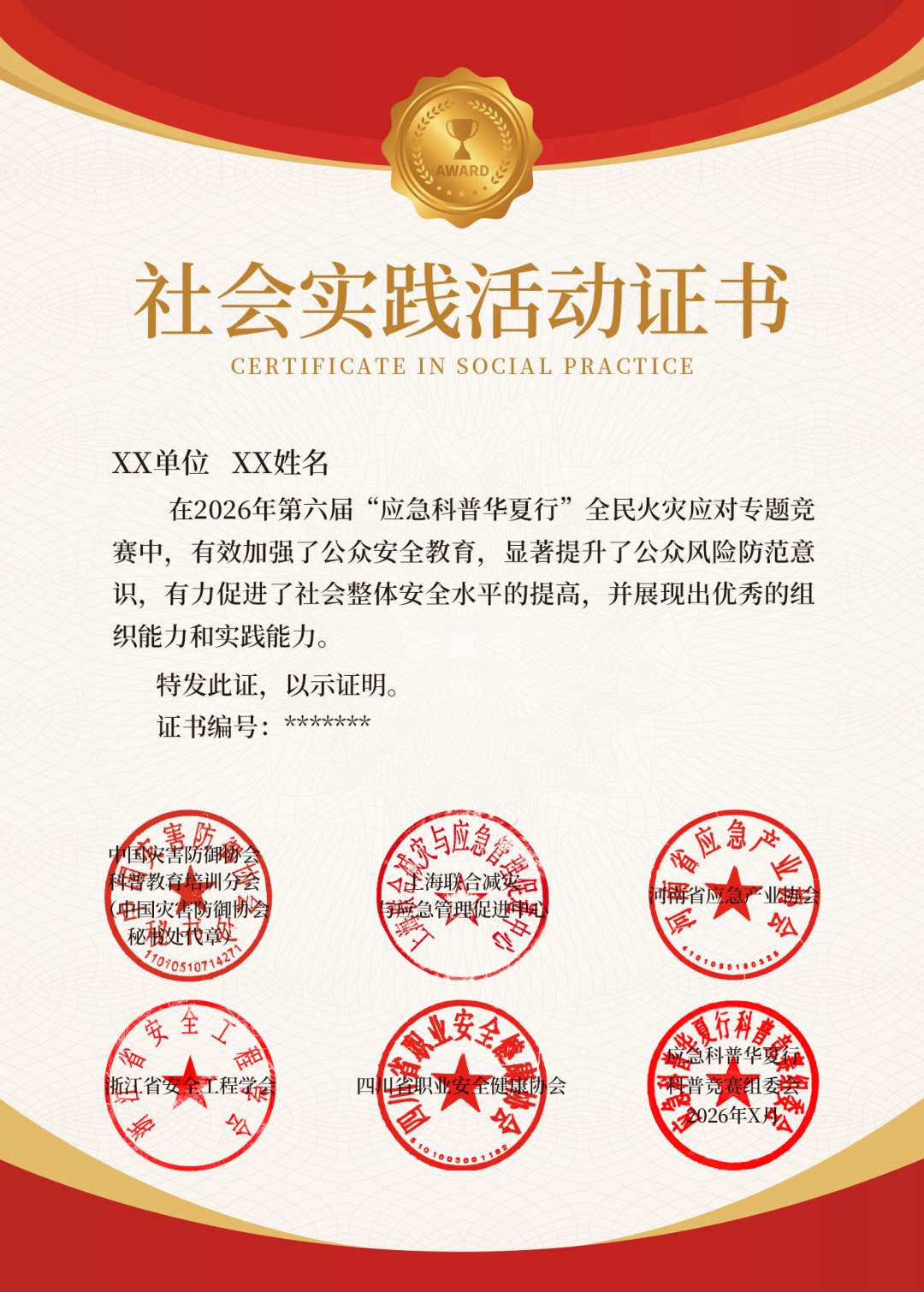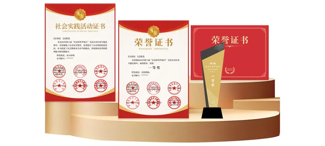 参加竞赛时,系统将随机从题库中抽取25道试题供参赛人员作答,其中含单选题15道、多选题5道、判断题5道,每道题分值4分。参赛者完成答题且得分大于等于60分即合格,答题合格者,可根据答题结束后页面提示获得《2026年第六届“应急科普华夏行”全民火灾应对专题竞赛》电子版荣誉证书,可作为评奖评优及社会实践活动的证明。