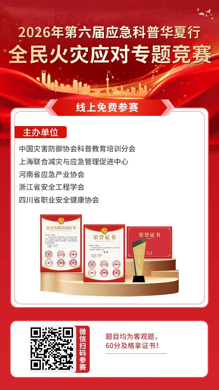 鉴于此,中国灾害防御协会科普教育培训分会联合上海联合减灾与应急管理促进中心、河南省应急产业协会、浙江省安全工程学会、四川省职业安全健康协会共同举办2026年第六届“应急科普华夏行”全民火灾应对专题竞赛,欢迎各广大参赛者踊跃参加。