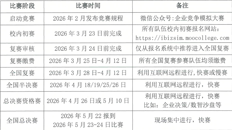 2、依据部分地区省市赛-国赛直通规则,在该地区省市赛规程中规定获得优秀成绩的队伍可获得一个直通“2026年全国企业竞争模拟大赛”半决赛的名额。该名额遵循以下规则使用:①在复赛报名截止前,将优秀队伍成绩相关证明材料(省市赛决赛赛区第一名的团队成员信息)邮件发送至ibizsim@163.com。②该队伍成员信息不可有任何变动,需与省市赛中的队伍信息保持一致。③该直通队伍仍须在摩课云报名系统中完成竞赛注册和报名。