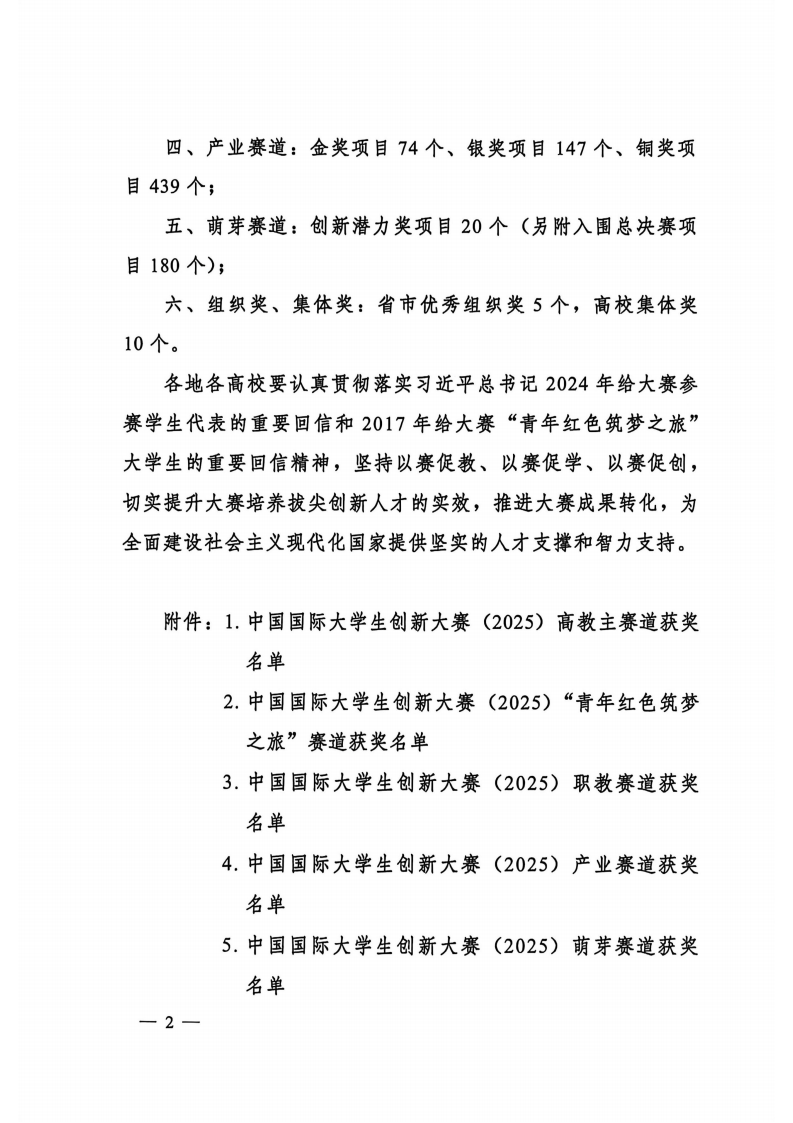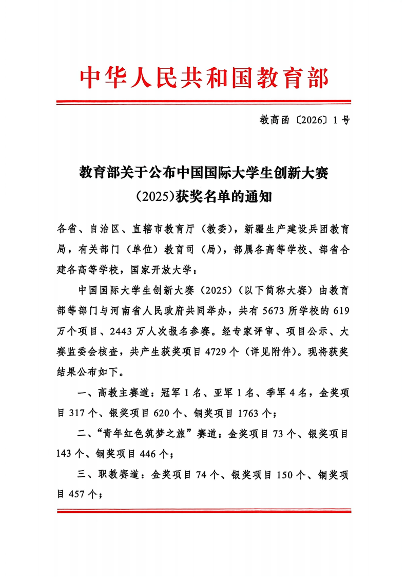 教育部关于公布中国国际大学生创新大赛(2025)获奖名单的通知 教育部关于公布中国国际大学生创新大赛(2025)获奖名单的通知.pdf 附件1 中国国际大学生创新大赛(2025)高教主赛道获奖名单.pdf 附件2 中国国际大学生创新大赛(2025)“青年红色筑梦之旅”赛道获奖名单.pdf 附件3 中国国际大学生创新大赛(2025)职教赛道获奖名单.pdf 附件4 中国国际大学生创新大赛(2025)产业赛道获奖名单.pdf 附件5 中国国际大学生创新大赛(2025)萌芽赛道获奖名单.pdf 附件6 中国国际大学生创新大赛(2025)优秀组织奖、高校集体奖获奖名单.pdf 本文信息搜集整理自互联网,信息版权及活动解释权归主办单位所有,我爱竞赛网仅作媒体支持。 请仔细看正文,正文里有报名办法,或者报名官网。