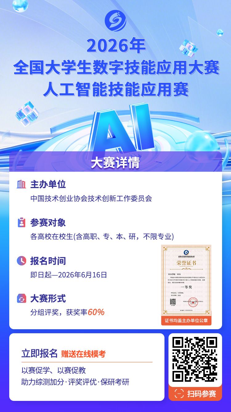 人工智能技能应用赛旨在响应国家创新驱动发展战略,通过“以赛促学、以赛促创、以赛促用”的实践模式,激发大学生对人工智能技术的探索热情与创新潜能。赛事鼓励学生将算法理论、数据思维与多领域场景深度融合,在解决真实世界复杂问题的过程中,锻炼技术应用、团队协作与系统设计能力。这不仅有助于学生构建具备前沿竞争力的知识体系与项目履历,为投身数字中国建设储备关键能力,更致力于搭建一个连接高校AI人才培养、前沿技术探索与产业智能化需求的桥梁,成为推动人工智能领域产 学研用协同创新与高质量人才生态建设的重要平台。