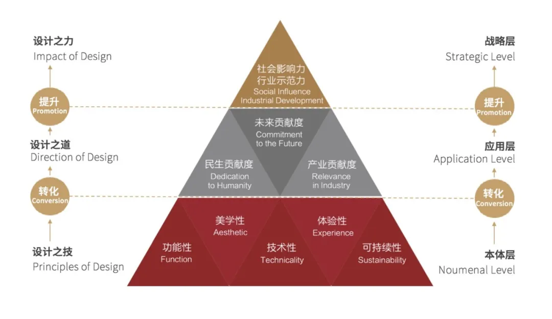 一是基础标准,强调“设计之技”,包含功能性、美学性、技术性、体验性、可持续性等评价因子;