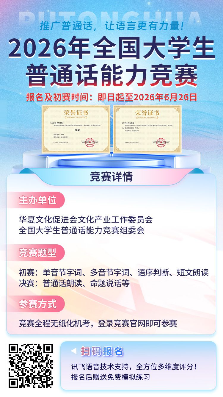 为贯彻落实《中华人民共和国国家通用语言文字法》实施要求,响应国家推动普通话高质量普及应用的政策号召,全面提升大学生普通话应用能力与文化素养,特举办2026年全国大学生普通话能力竞赛。本届竞赛旨在激发广大青年学生学习和使用国家通用语言文字的主动性,切实提高其普通话规范应用能力,促进高校语言文字教育与实践应用深度融合。现面向全社会征集竞赛组织宣传志愿者。