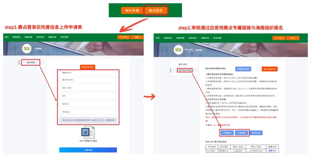 每个院校只可指定一名负责人进行赛点申请,点击【赛点登录】按钮,使用申请人本人QQ登录,完善赛点相应信息后下载赛点院校申请函,按要求填写并盖章后回传申请函或者上传负责人任职证明(如教师工作证、社团聘书等),等待审核通过。①赛点申请盖章文件②负责人任职证明(如教师工作证、社团聘书等)以上①②申请文件二选一上传即可