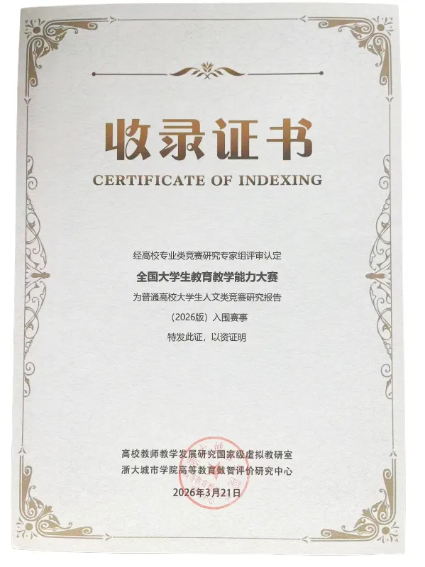 会议现场,国家级教学名师、浙江大学求是特聘教授何钦铭作《高校大学生竞赛指数研究报告》,重磅发布2026版人文类、计算机类、机器人类、艺术与设计大类等十大专业类竞赛指数。全国大学生教育教学能力大赛连续入选普通高校大学生人文类竞赛指数(2026版)榜单赛事,这标志着教育教学能力大赛在规范性、行业影响力及育人成效方面,再次获得高等教育领域的权威认可与高度肯定。