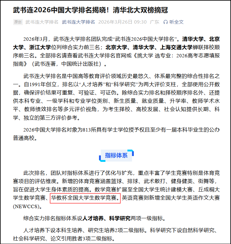 2026年3月,国内权威高等教育评价机构武书连大学排名团队正式发布《武书连2026中国大学排名》,清华北大双榜摘冠!本次排名对评价指标体系进行了重要优化与扩充,其中华教杯全国大学生数学竞赛正式被纳入排名数学竞赛类评估维度,成为中国大学综合实力评价中人才培养板块的重要参考指标,标志着该赛事在学术影响力、权威性及人才培养价值方面获得第三方评价机构的高度认可。